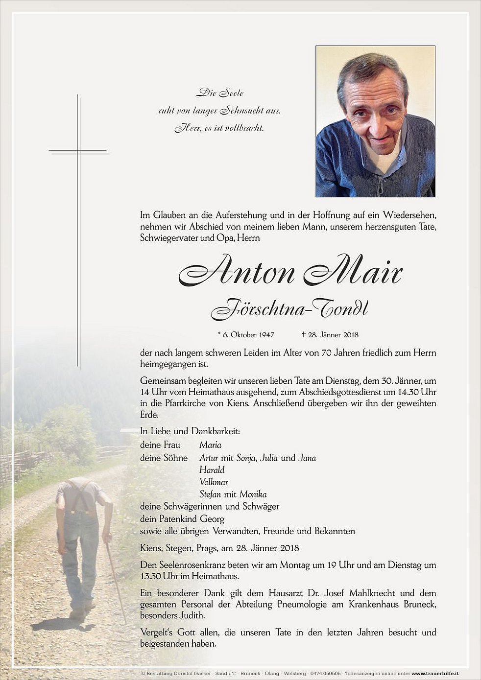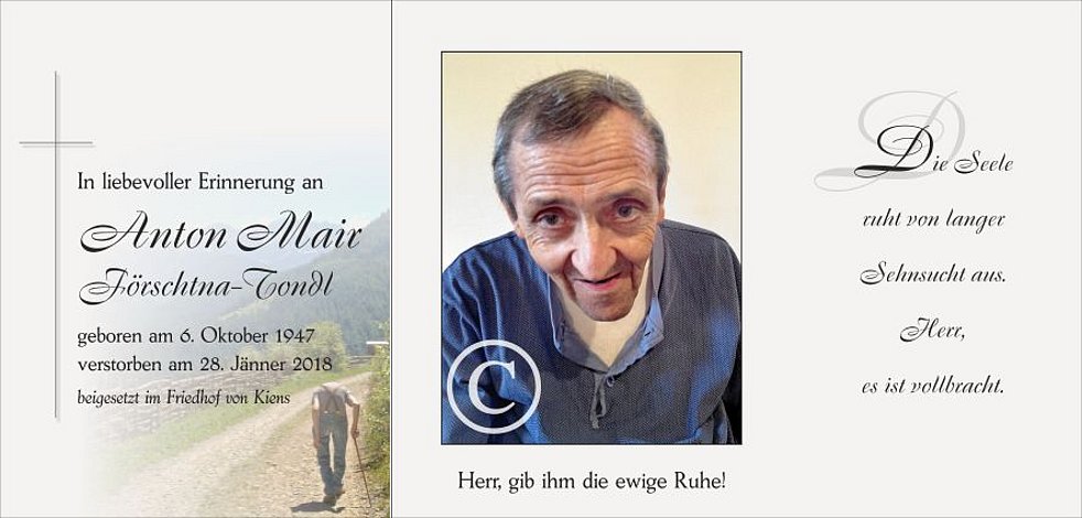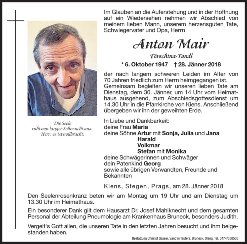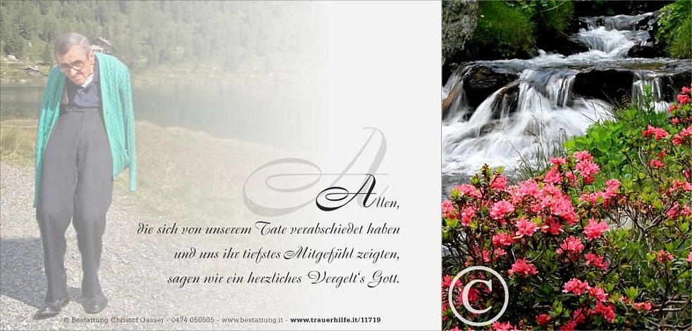 Gemeinsam begleiten wir unseren lieben Tate am Dienstag, dem 30. Jänner, um 14 Uhr vom Heimathaus ausgehend, zum Abschiedsgottesdienst um 14.30 Uhr in die Pfarrkirche von Kiens. Anschließend übergeben wir ihn der geweihten Erde.
