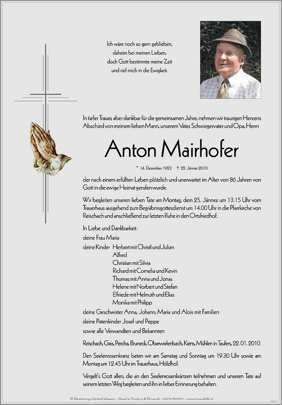 Wir begleiten unseren lieben Tate am Montag, dem 25. Jänner, um 13.15 Uhr vom Trauerhaus ausgehend zum Begräbnisgottesdienst um 14.00 Uhr in die Pfarrkirche von Reischach und anschließend zur letzten Ruhe in den Ortsfriedhof.