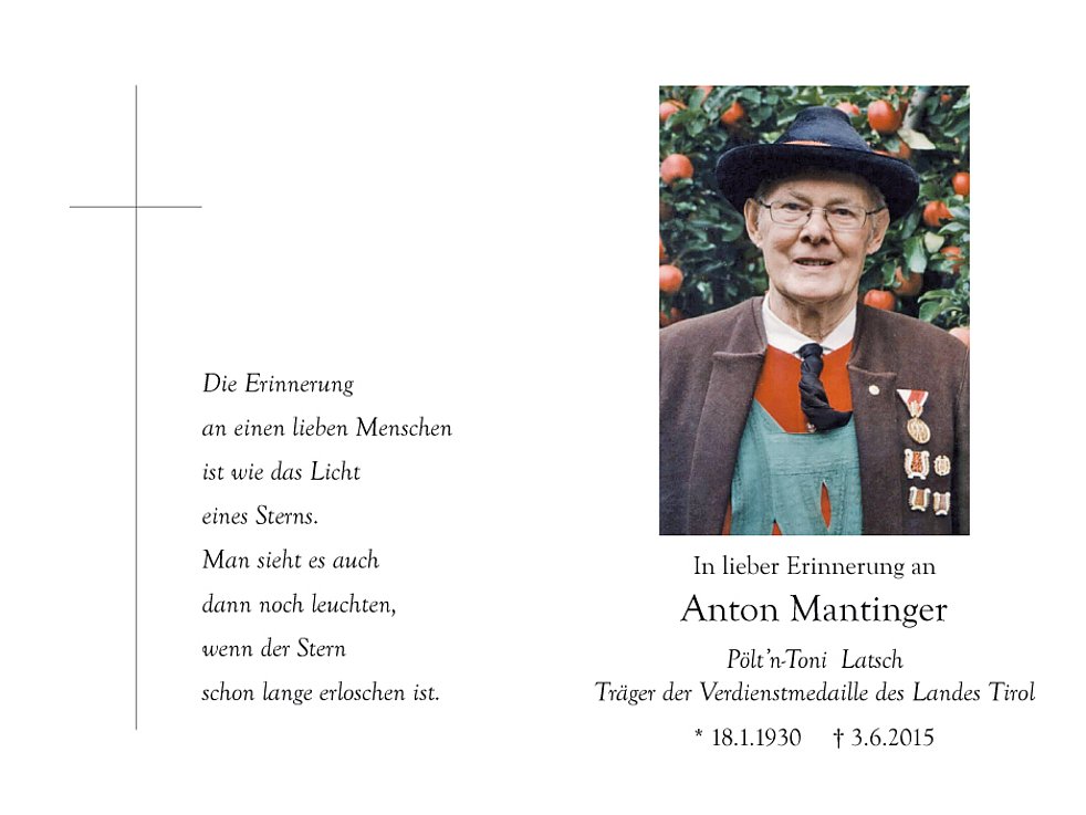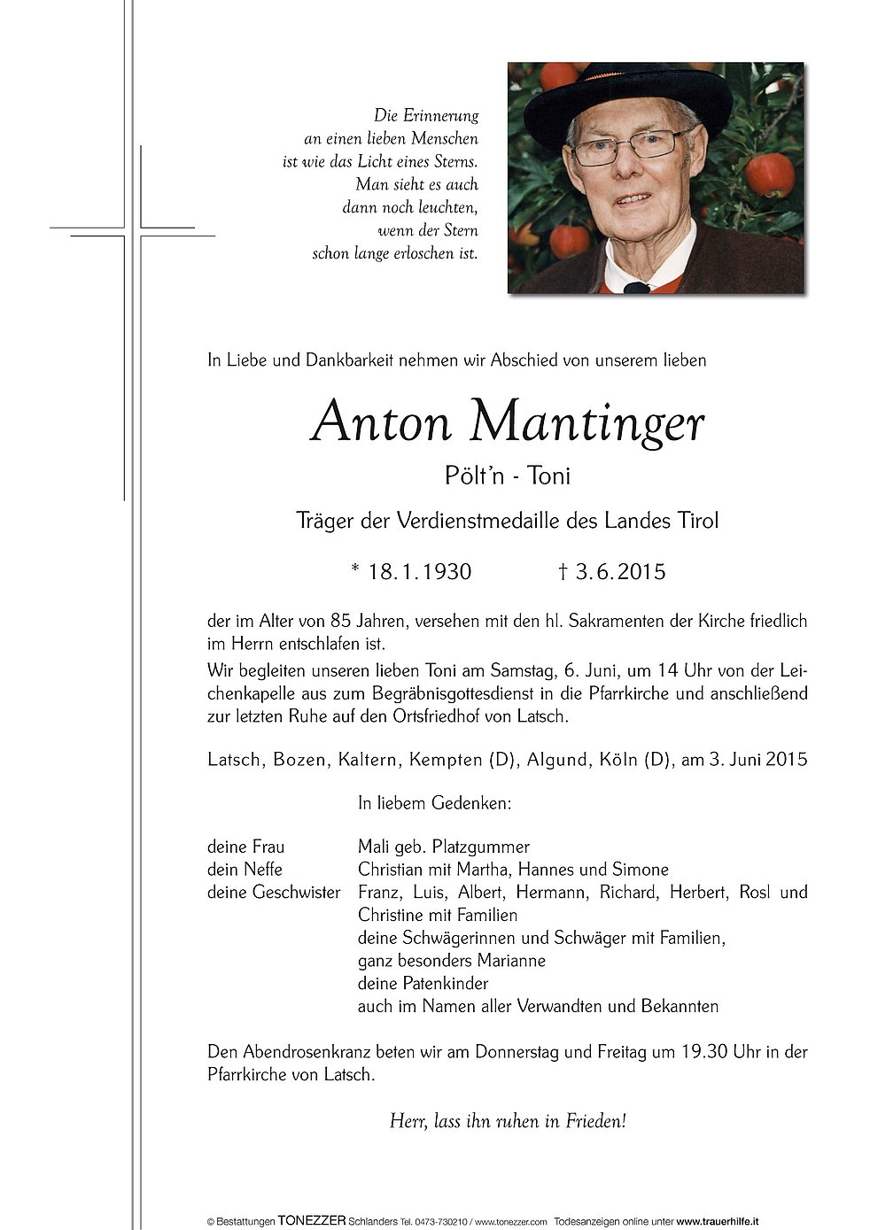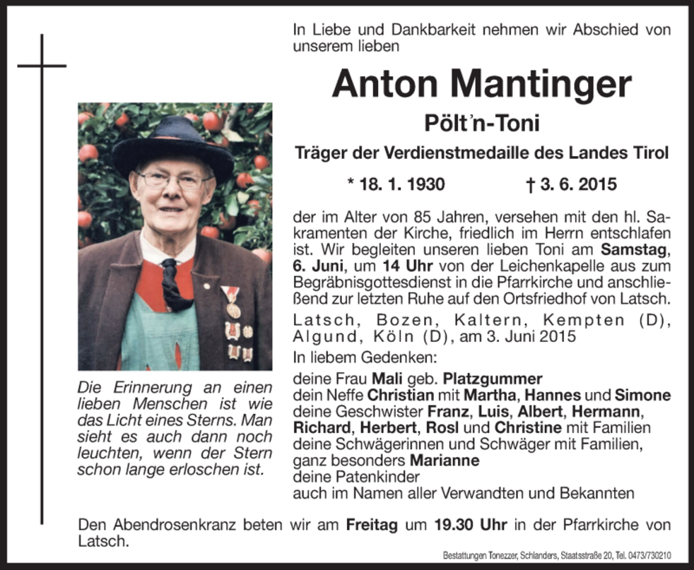Wir begleiten unseren lieben Toni am Samstag, 6. Juni, um 14 Uhr von der Leichenkapelle aus zum Begräbnisgottesdienst in die Pfarrkirche und anschließend zur letzten Ruhe auf den Ortsfriedhof von Latsch.