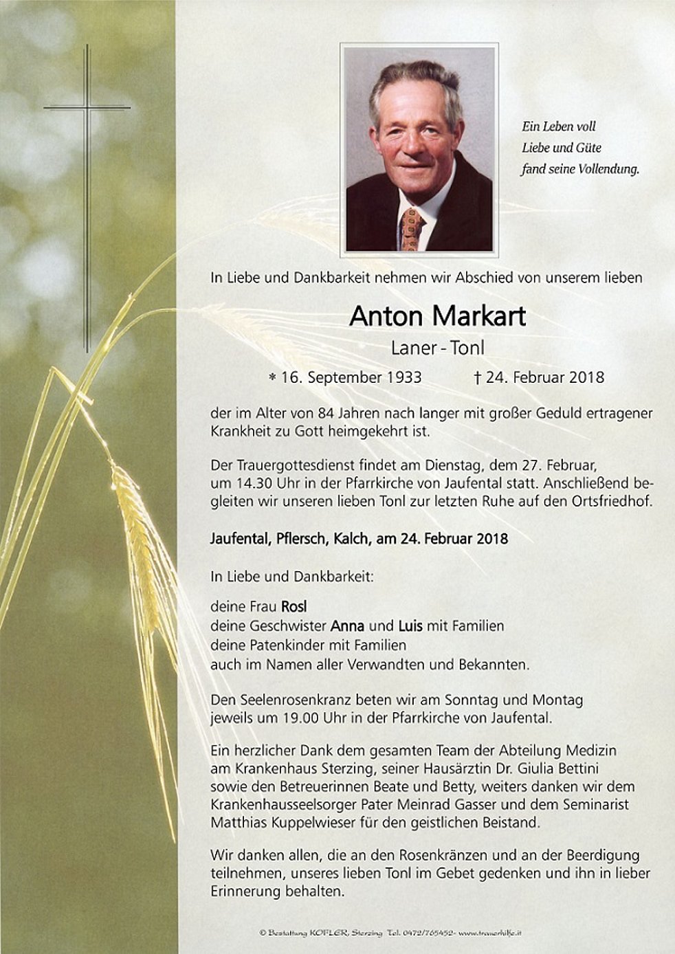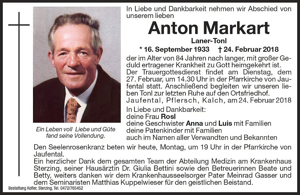 Der Trauergottesdienst findet am Dienstag, dem 27. Februar, um 14.30 Uhr in der Pfarrkirche von Jaufental statt. Anschließend begleiten wir unseren lieben Tonl zur letzten Ruhe auf den Ortsfriedhof.