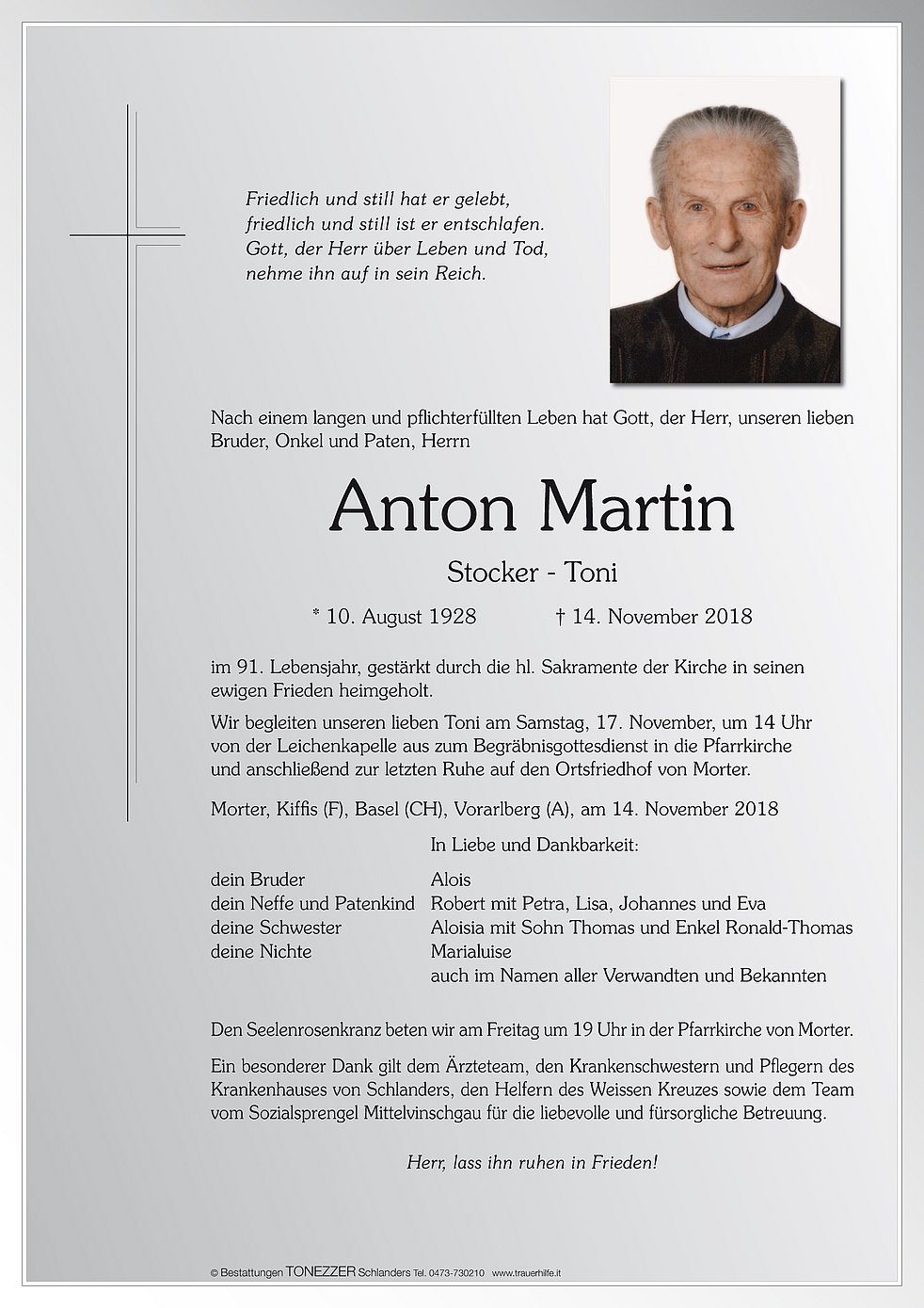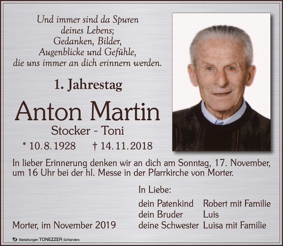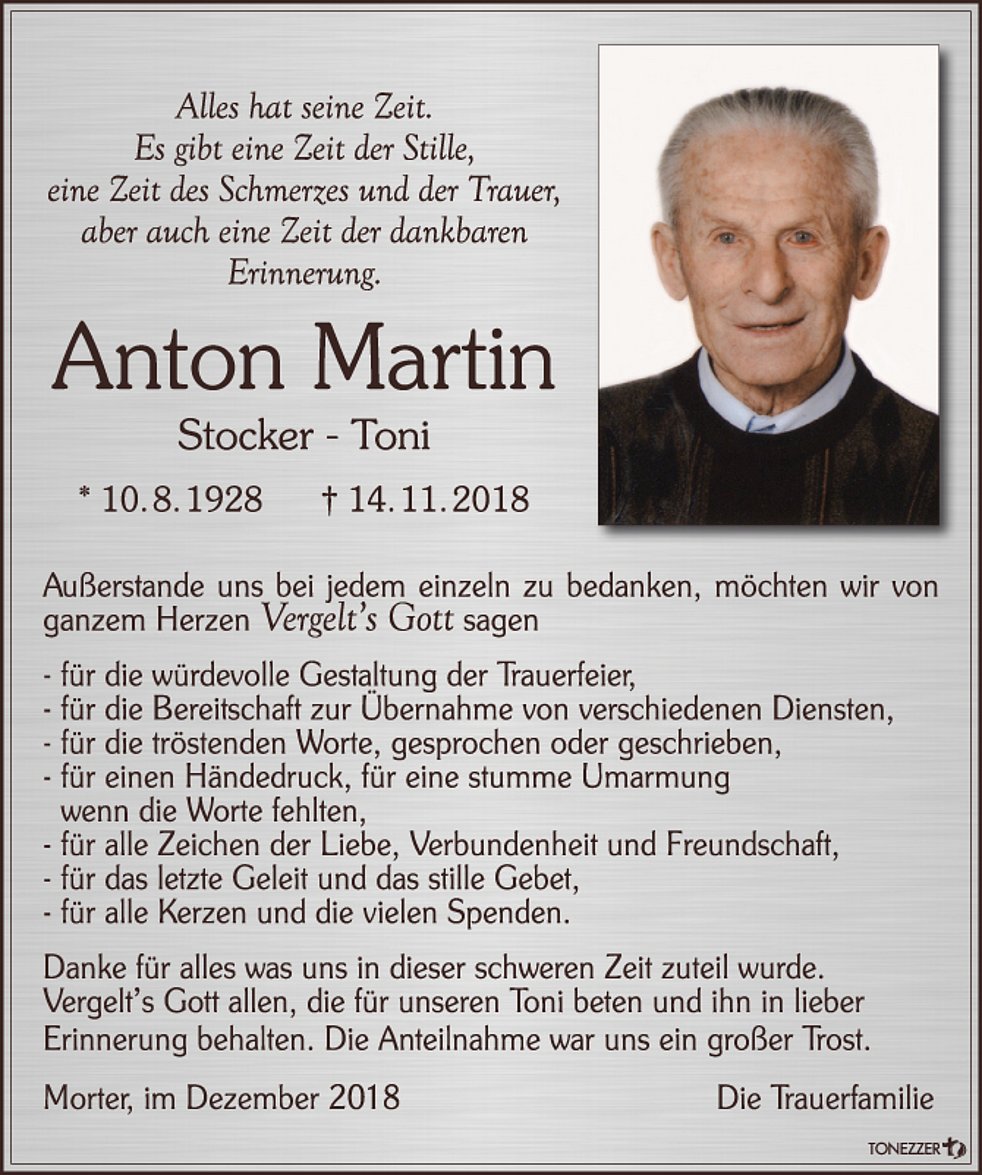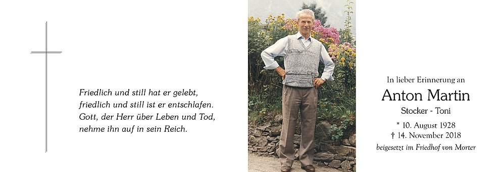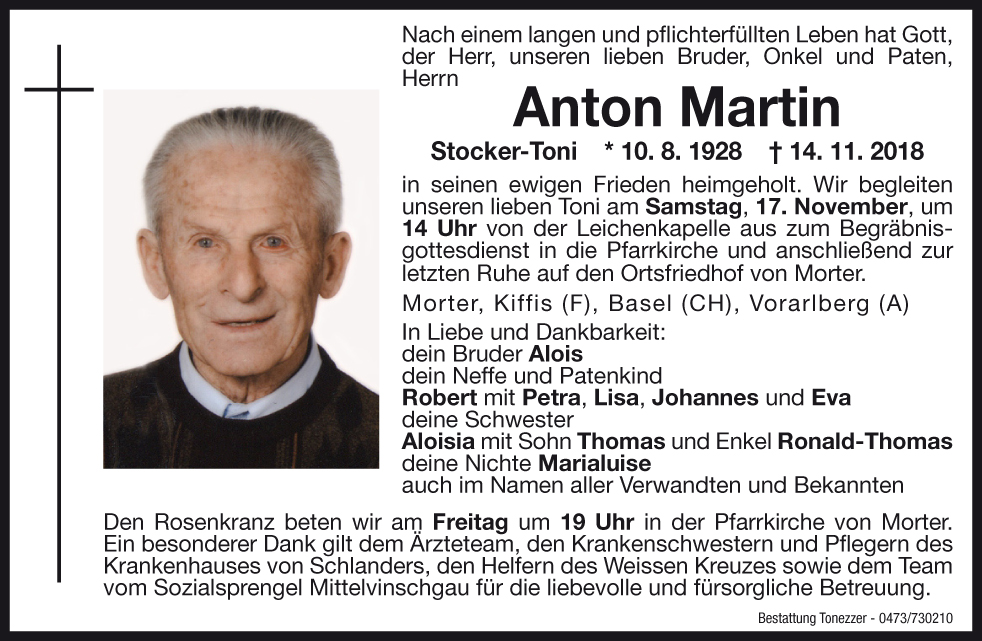 Wir begleiten unseren lieben Toni am Samstag, 17. November, um 14 Uhr von der Leichenkapelle aus zum Begräbnisgottesdienst in die Pfarrkirche und anschließend zur letzten Ruhe auf den Ortsfriedhof von Morter.