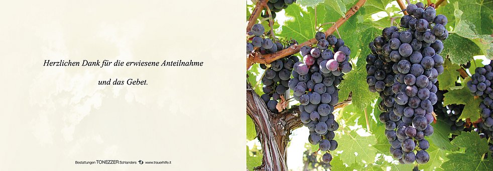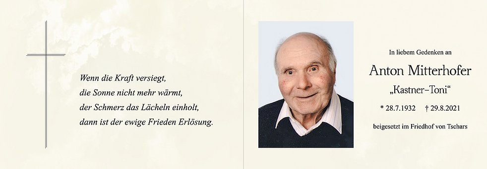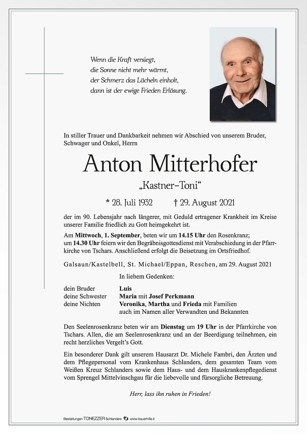 Ein besonderer Dank gilt unserem Hausarzt Dr. Michele Fambri, den Ärzten und dem Pflegepersonal vom Krankenhaus Schlanders, dem gesamten Team vom Weißen Kreuz Schlanders sowie dem Haus- und dem Hauskrankenpflegedienst vom Sprengel Mittelvinschgau für die liebevolle und fürsorgliche Betreuung.