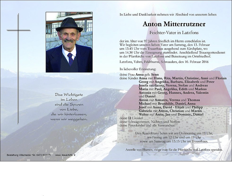 um 14.30 Uhr die Einsegnung stattfindet. Anschließend Trauergottesdienst in der Pfarrkirche von Latzfons und Beisetzung im Ortsfriedhof.