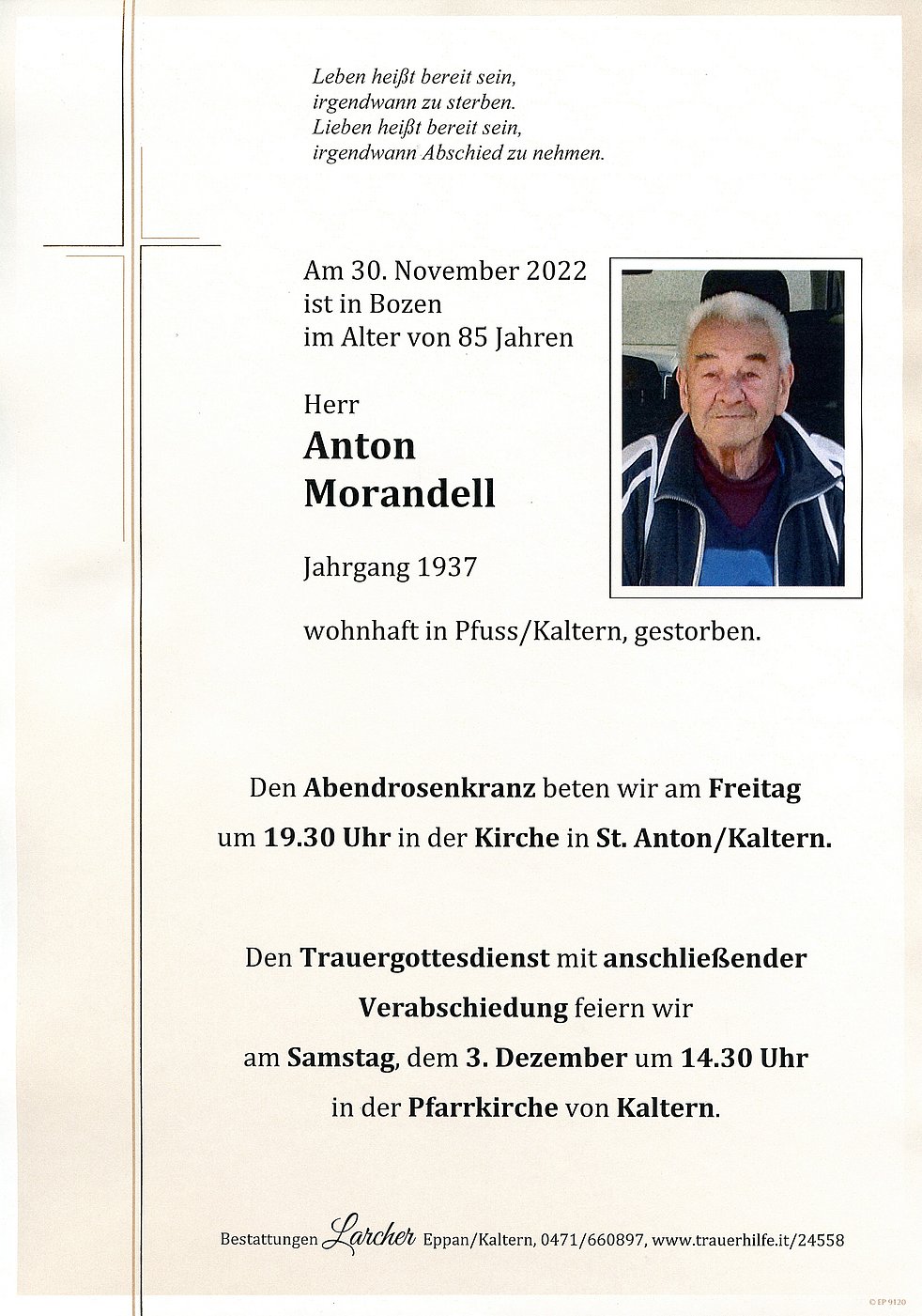 Den Trauergottesdienst mit anschließender Verabschiedung feiern wir am Samstag, dem 3. Dezember um 14.30 Uhr in der Pfarrkirche von Kaltern.