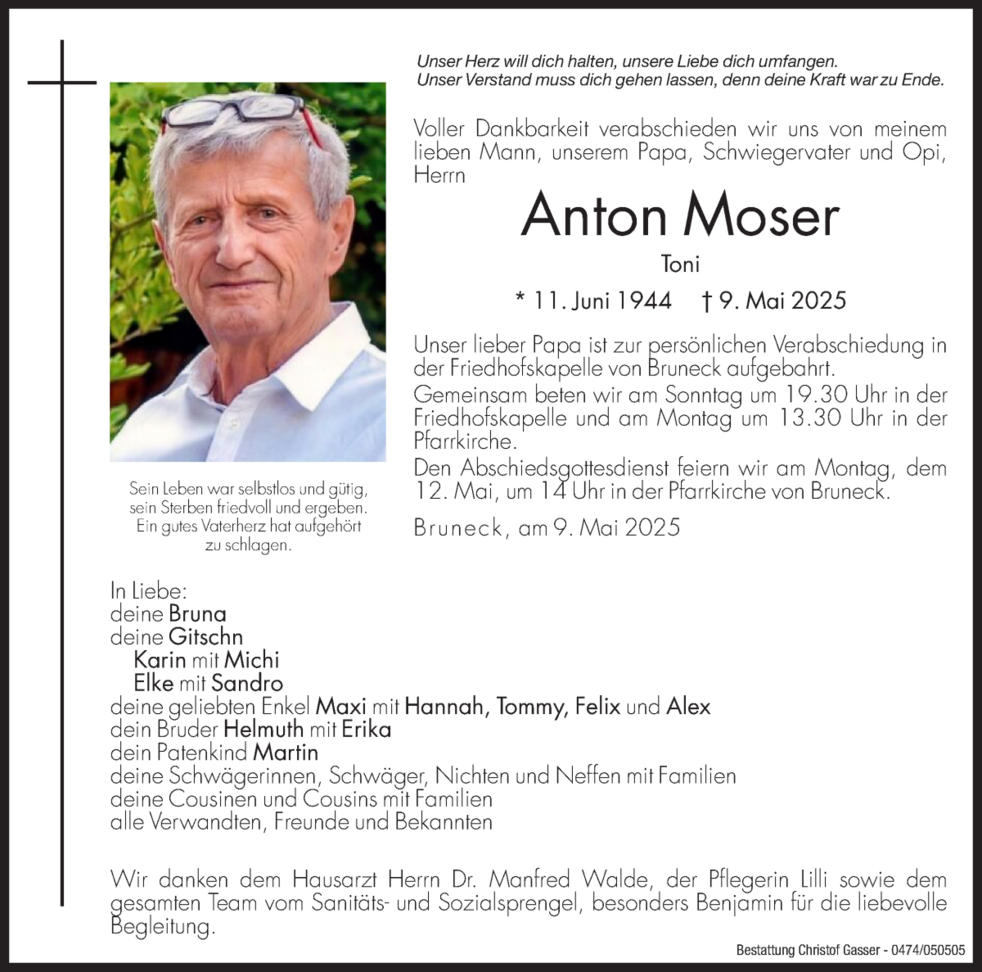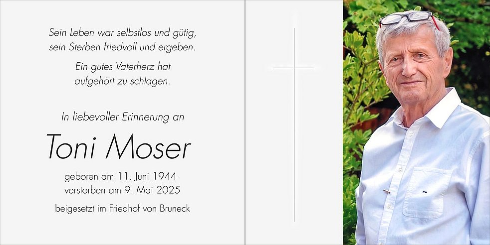 Unser lieber Papa ist ab Samstag zur persönlichen Verabschiedung in der Friedhofskapelle von Bruneck aufgebahrt.