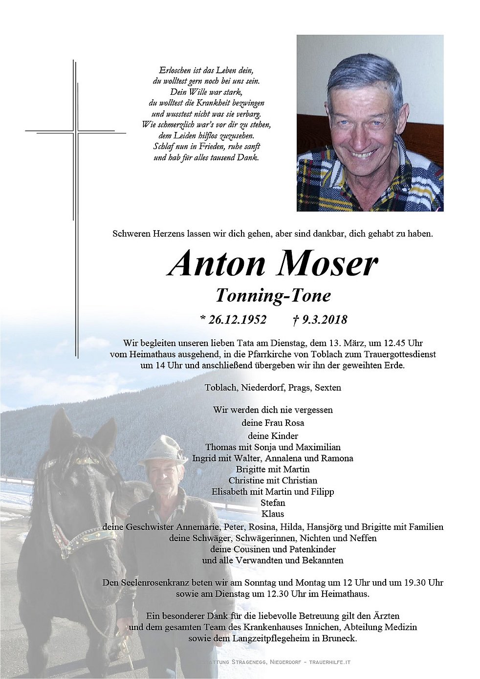 Wir begleiten unseren lieben Tata am Dienstag, dem 13. März, um 12.45 Uhr vom Heimathaus ausgehend, in die Pfarrkirche von Toblach zum Trauergottesdienst um 14 Uhr und anschließend übergeben wir ihn der geweihten Erde.