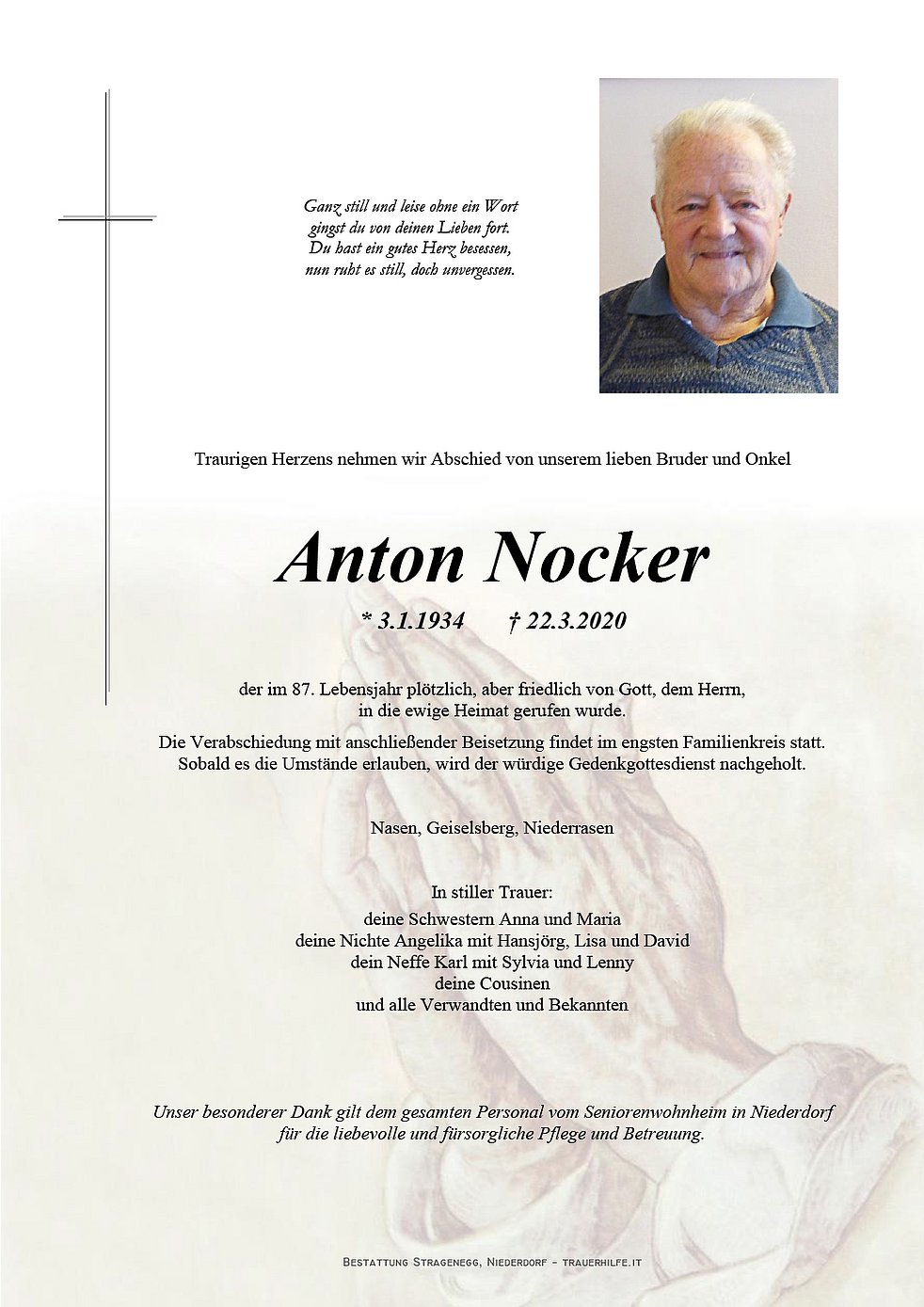 Unser besonderer Dank gilt dem gesamten Personal vom Seniorenwohnheim in Niederdorf für die liebevolle und fürsorgliche Pflege und Betreuung.