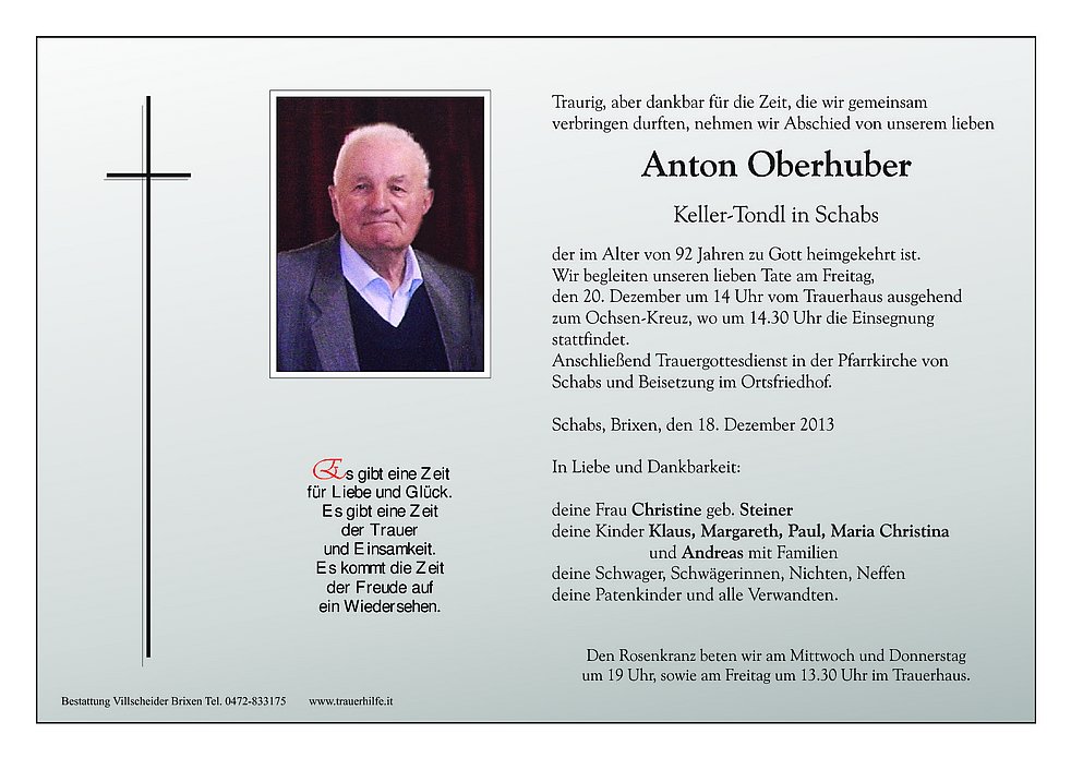 Anschließend Trauergottesdienst in der Pfarrkirche von Schabs und Beisetzung im Ortsfriedhof.
