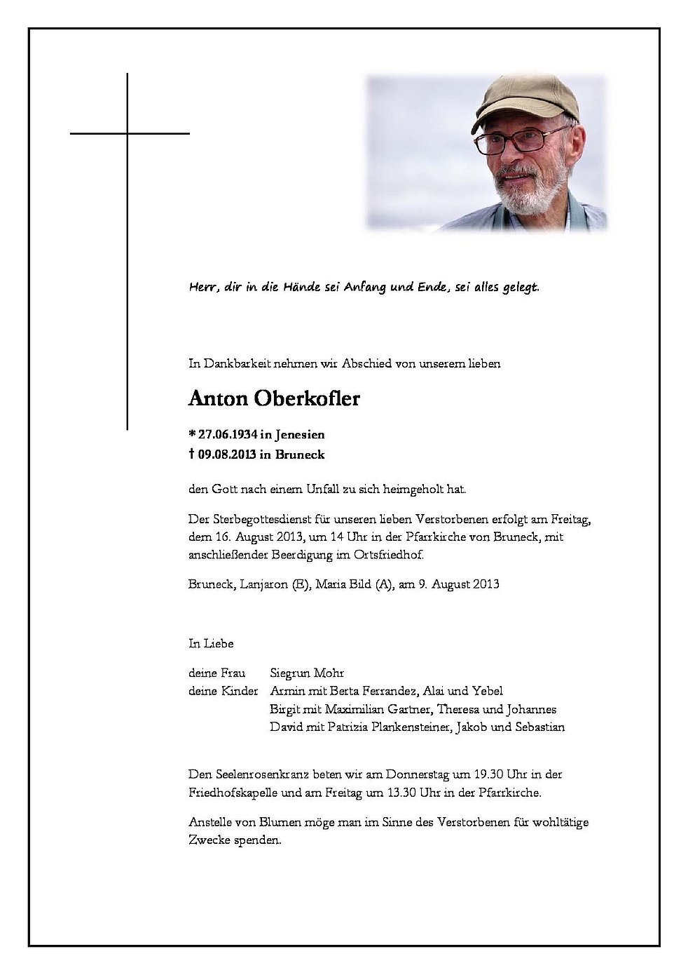 Der Sterbegottesdienst für unseren lieben Verstorbenen erfolgt am Freitag, dem 16. August 2013, um 14 Uhr in der Pfarrkirche von Bruneck, mit anschließender Beerdigung im Ortsfriedhof.