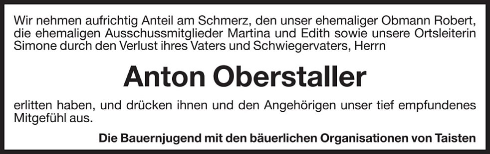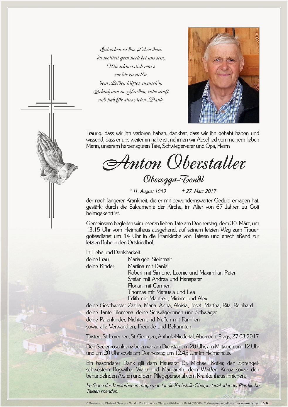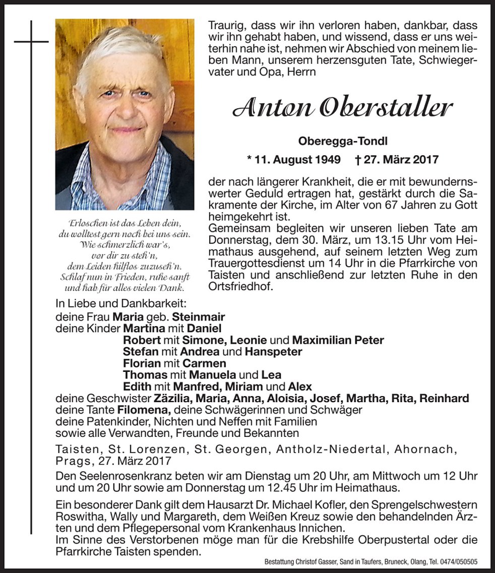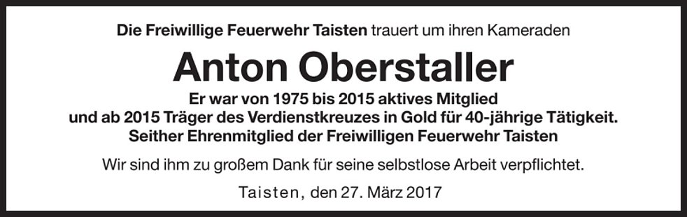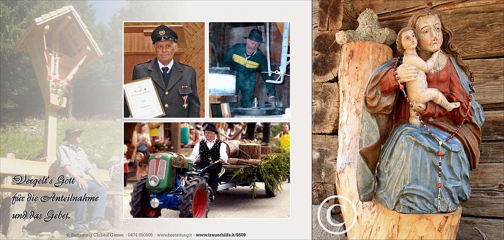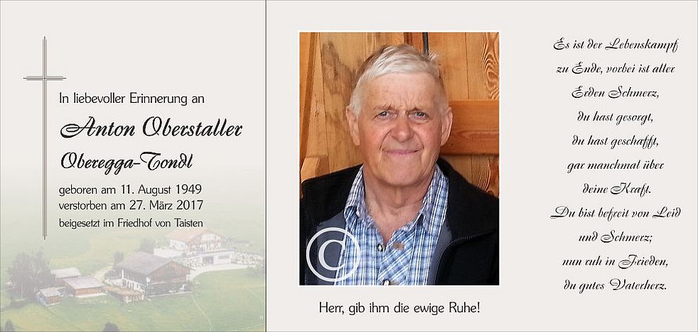 Gemeinsam begleiten wir unseren lieben Tate am Donnerstag, dem 30. März, um 13.15 Uhr vom Heimathaus ausgehend, auf seinem letzten Weg zum Trauer-gottesdienst um 14 Uhr in die Pfarrkirche von Taisten und anschließend zur letzten Ruhe in den Ortsfriedhof.
