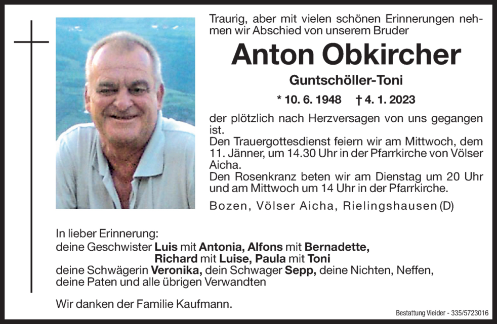 Den Trauergottesdienst feiern wir am Mittwoch, dem 11. Jänner, um 14.30 Uhr in der Pfarrkirche von Völser Aicha.