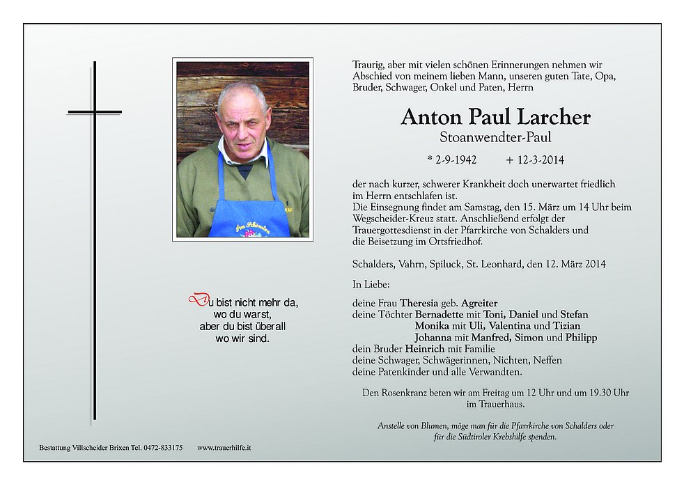Anstelle von Blumen, möge man für die Pfarrkirche von Schalders oder