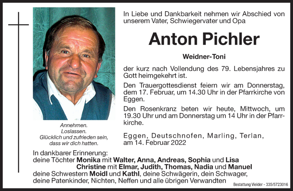 Den Trauergottesdienst feiern wir am Donnerstag, dem 17. Februar, um 14.30 Uhr in der Pfarrkirche von Eggen.