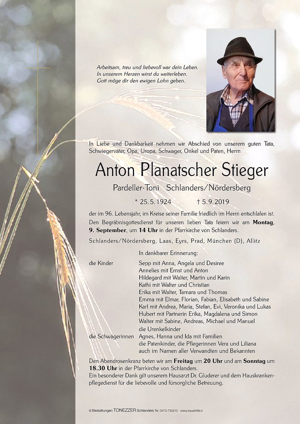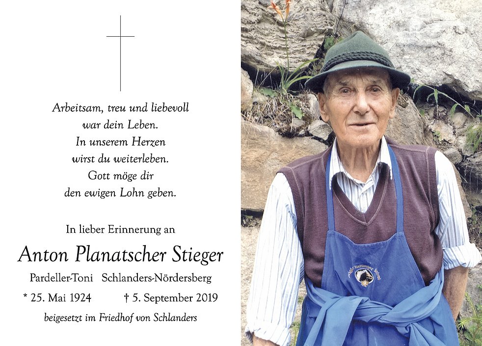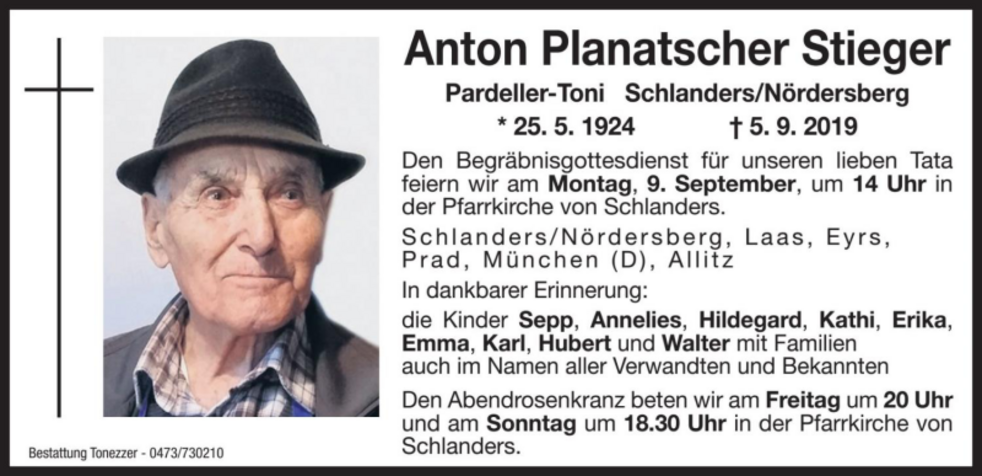 Den Begräbnisgottesdienst für unseren lieben Tata feiern wir am Montag, 9. September, um 14 Uhr in der Pfarrkirche von Schlanders.