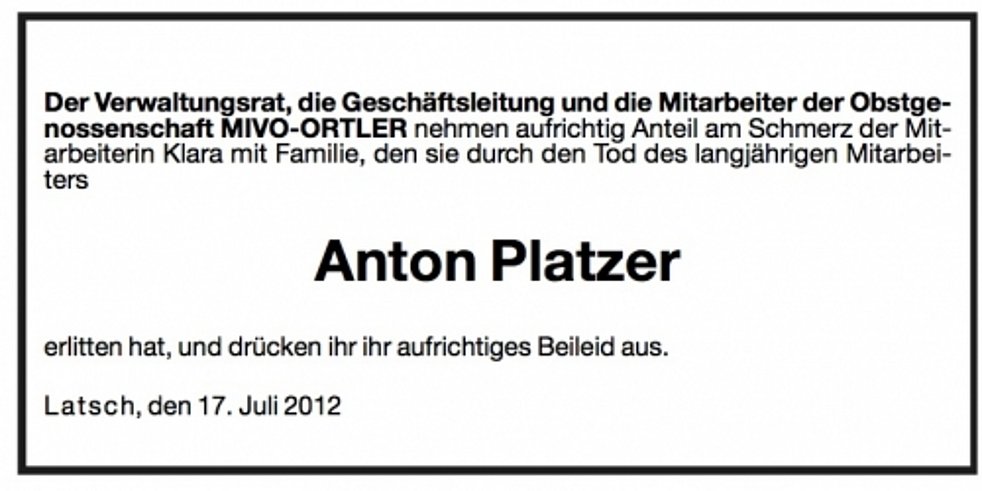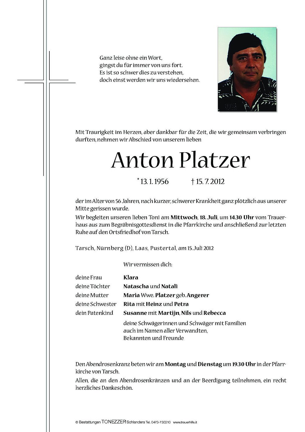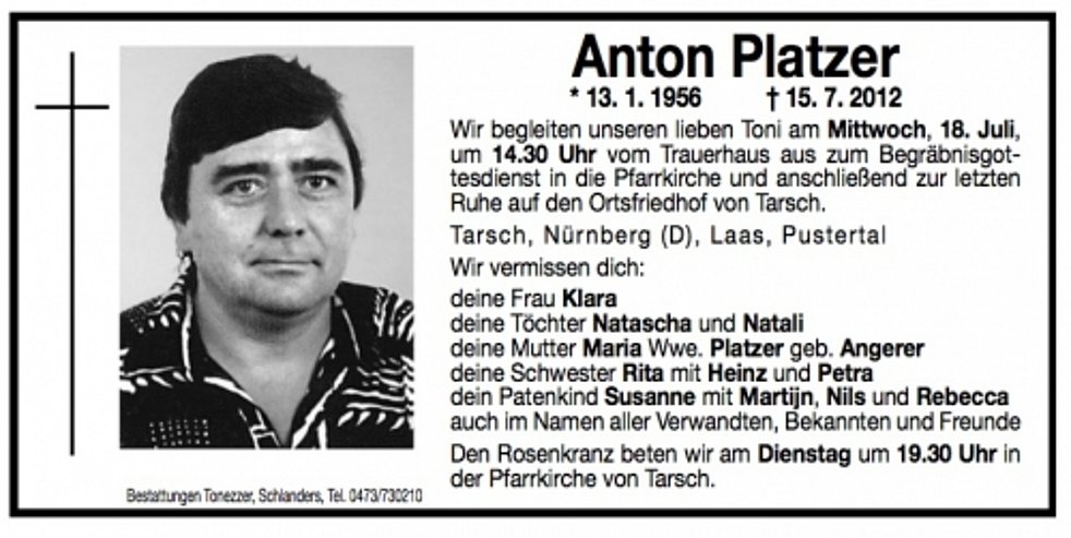 Wir begleiten unseren lieben Toni am Mittwoch, 18. Juli, um 14.30 Uhr vom Trauerhaus aus zum Begräbnisgottesdienst in die Pfarrkirche und anschließend zur letzten Ruhe auf den Ortsfriedhof von Tarsch.