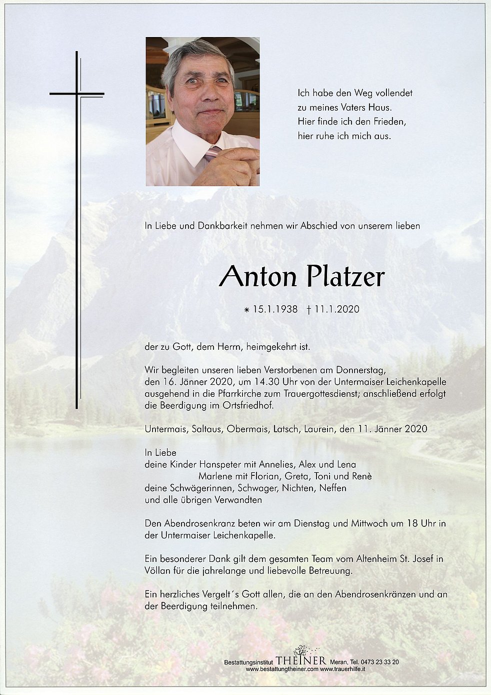 Wir begleiten unseren lieben Verstorbenen am Donnerstag, den 16. Jänner 2020, um 14.30 Uhr von der Untermaiser Leichenkapelle ausgehend in die Pfarrkirche zum Trauergottesdienst; anschließend erfolgt die Beerdigung im Ortsfriedhof.