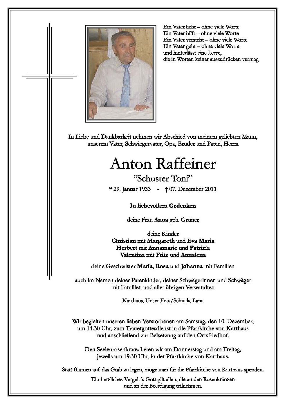 Wir übermitteln auf diesem Wege unser aufrichtiges Beileid, der Familie Herbert Raffeiner zum Verlust des lieben Vaters und Opas. Dein Schwager Gerhard und Annelies mit Familie