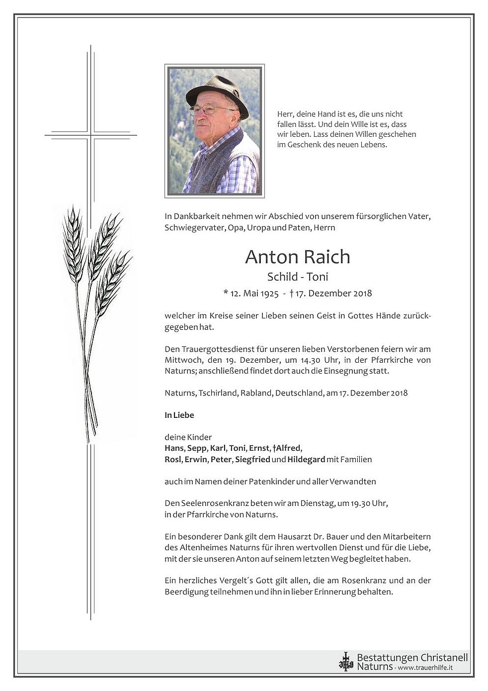 Ein besonderer Dank gilt dem Hausarzt Dr. Bauer und den Mitarbeitern des Altenheimes Naturns für ihren wertvollen Dienst und für die Liebe, mit der sie unseren Anton auf seinem letzten Weg begleitet haben.