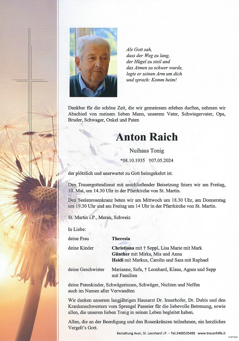 Allen, die an der Beerdigung und den Rosenkränzen teilnehmen, ein herzliches Vergelt’s Gott.