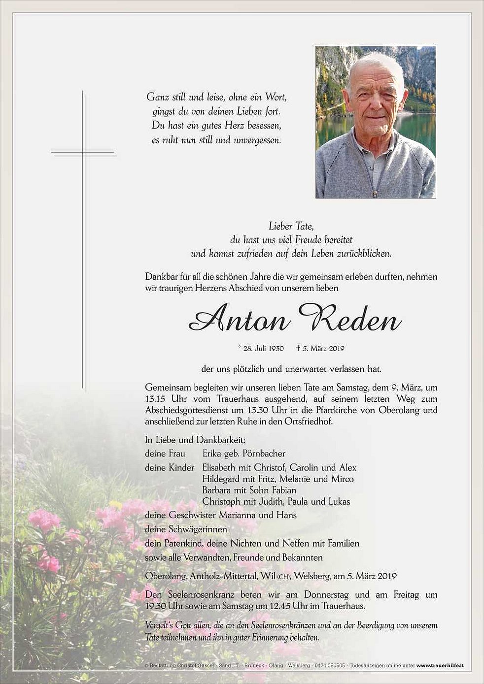Gemeinsam begleiten wir unseren lieben Tate am Samstag, dem 9. März, um 13.15 Uhr vom Trauerhaus ausgehend, auf seinem letzten Weg zum Abschiedsgottesdienst um 13.30 Uhr in die Pfarrkirche von Oberolang und anschließend zur letzten Ruhe in den Ortsfriedhof.