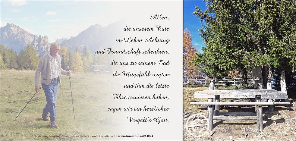 Vergelt‘s Gott allen, die an den Seelenrosenkränzen und an der Beerdigung von unserem Tate teilnehmen und ihn in guter Erinnerung behalten.