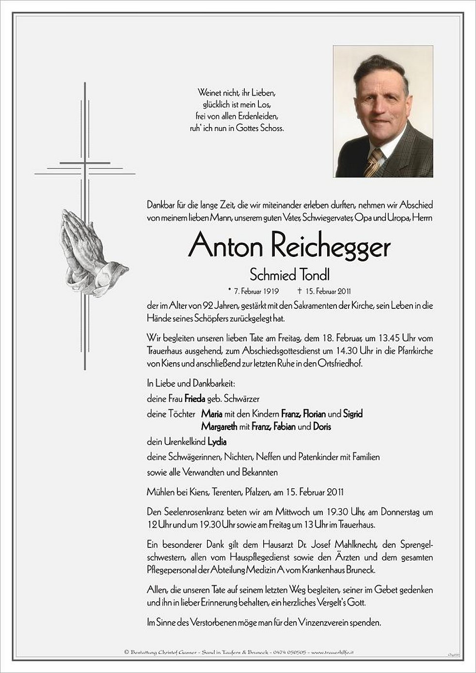 Wir begleiten unseren lieben Tate am Freitag, dem 18. Februar, um 13.45 Uhr vom Trauerhaus ausgehend, zum Abschiedsgottesdienst um 14.30 Uhr in die Pfarrkirche von Kiens und anschließend zur letzten Ruhe in den Ortsfriedhof.