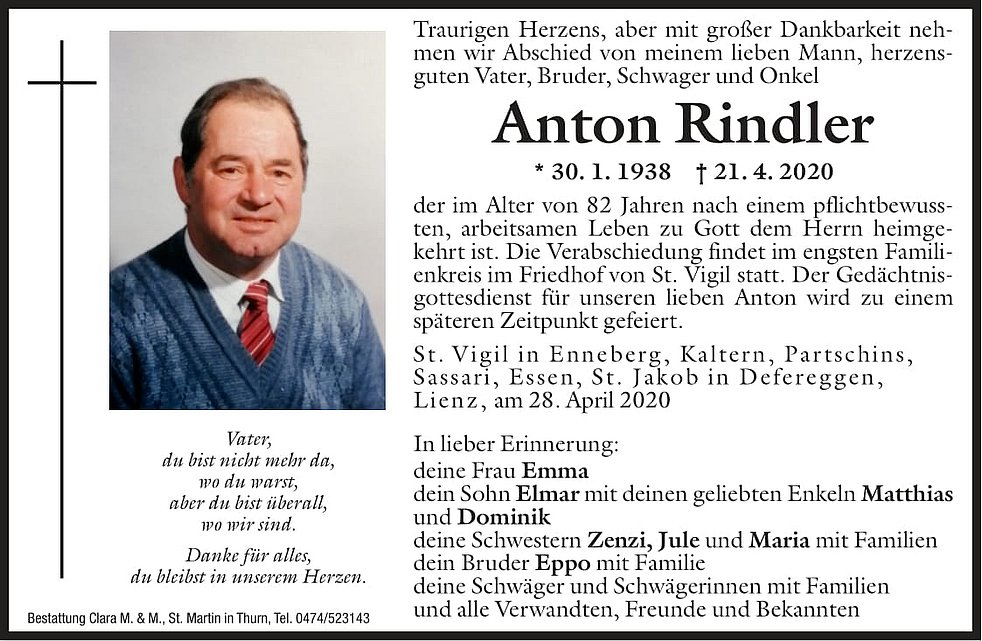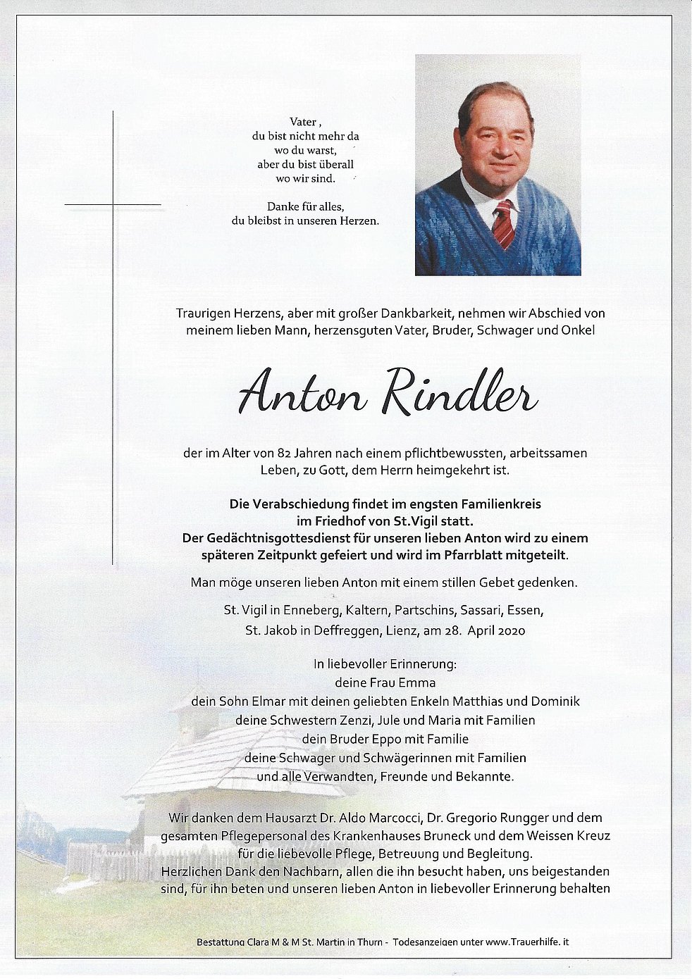 Man möge unseren lieben Anton mit einem stillen Gebet gedenken.