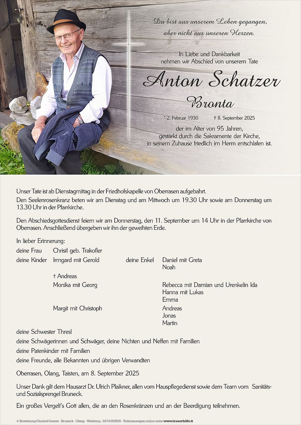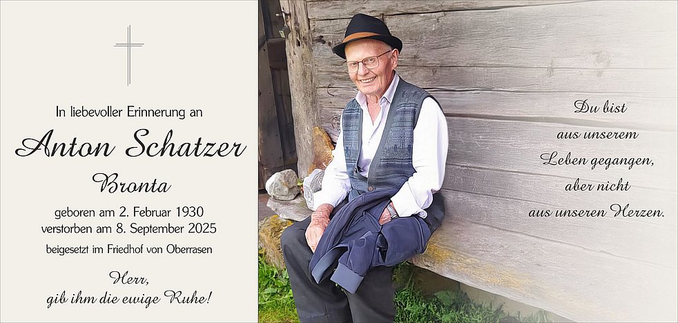 Den Abschiedsgottesdienst feiern wir am Donnerstag, den 11. September um 14 Uhr in der Pfarrkirche von Oberrasen. Anschließend übergeben wir ihn der geweihten Erde.