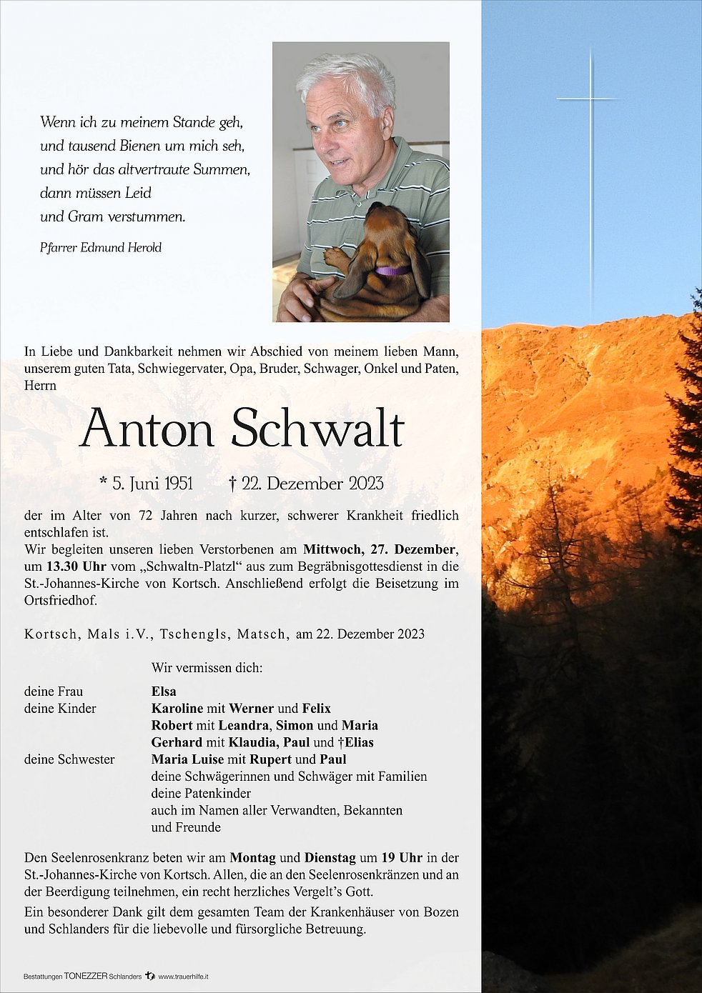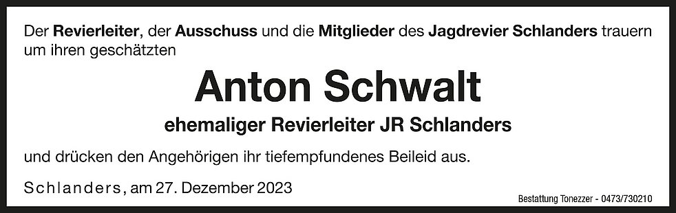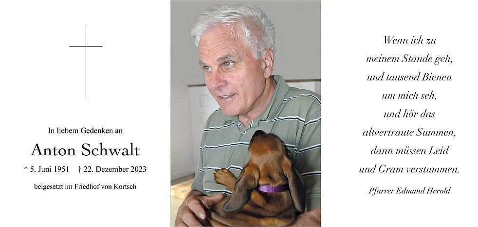 Wir begleiten unseren lieben Verstorbenen am Mittwoch, 27. Dezember, um 13.30 Uhr vom „Schwaltn-Platzl“ aus zum Begräbnisgottesdienst in die