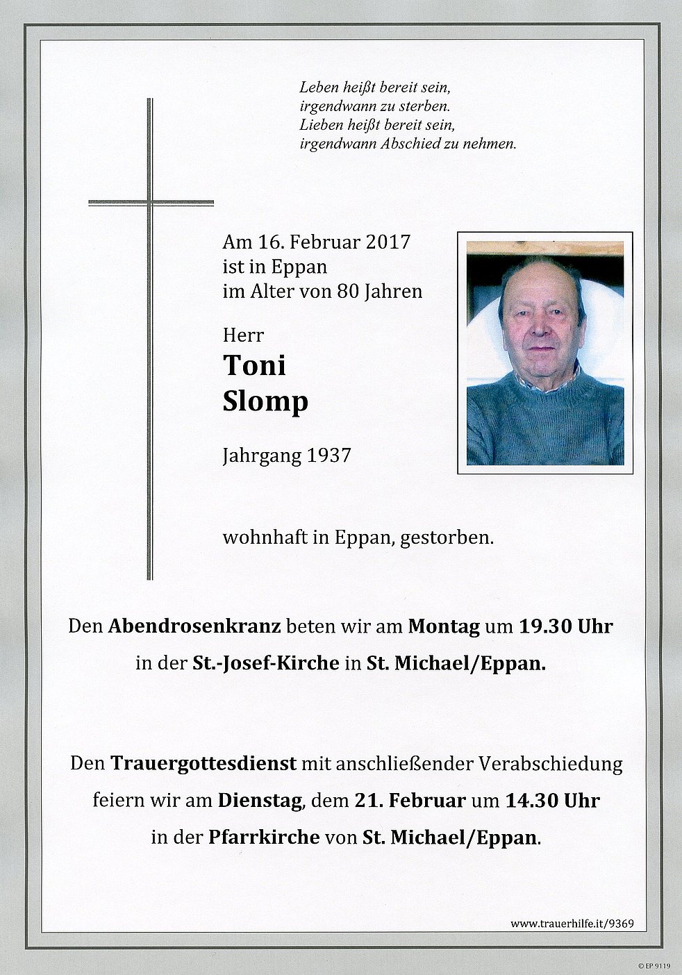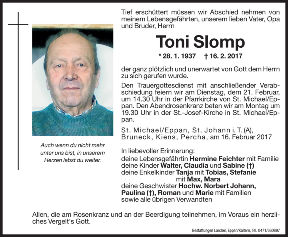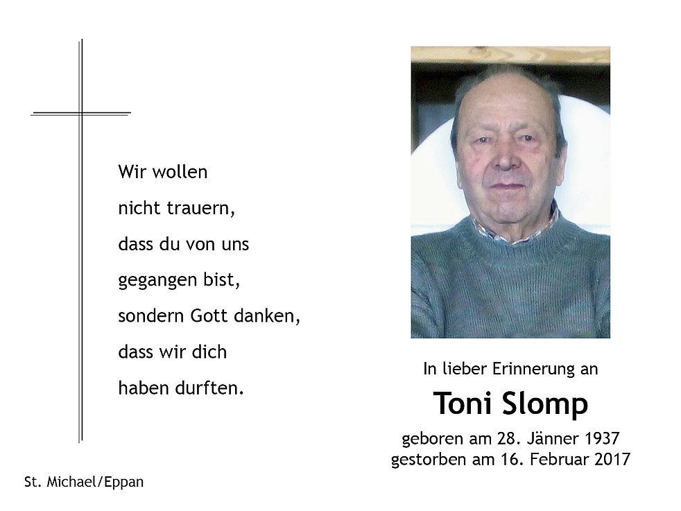 Den Trauergottesdienst mit anschließender Verabschiedung feiern wir am Dienstag, dem 21. Februar um 14.30 Uhr in der Pfarrkirche von St. Michael/Eppan.