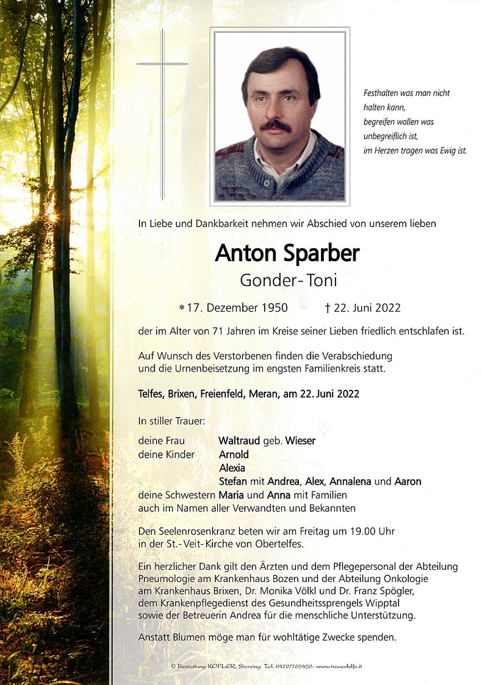 Ein herzlicher Dank gilt den Ärzten und dem Pflegepersonal der Abteilung Pneumologie am Krankenhaus Bozen und der Abteilung Onkologie am Krankenhaus Brixen, Dr. Monika Völkl und Dr. Franz Spögler, dem Krankenpflegedienst des Gesundheitssprengels Wipptal sowie der Betreuerin Andrea für die menschliche Unterstützung.