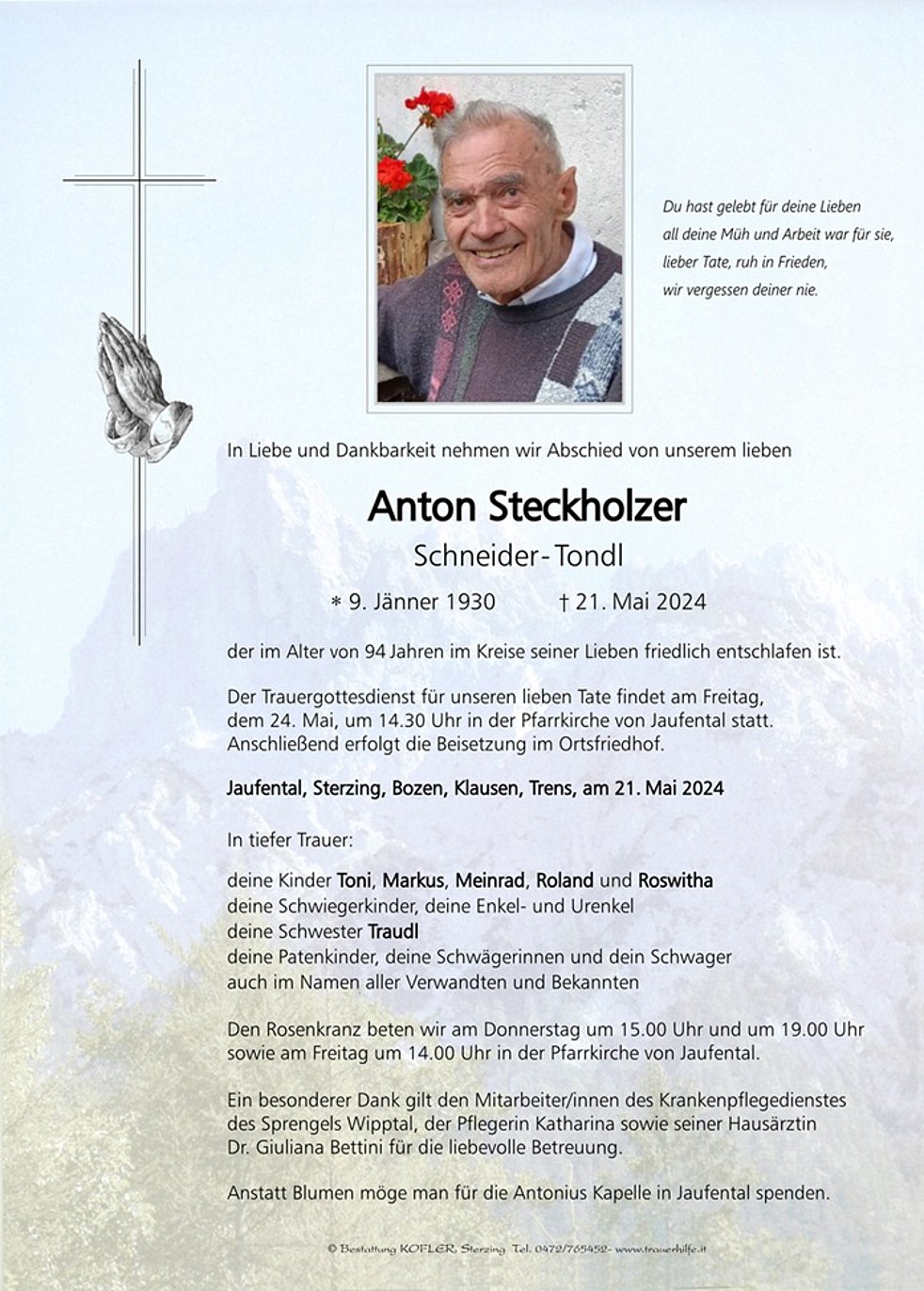 Der Trauergottesdienst für unseren lieben Tate findet am Freitag, dem 24. Mai, um 14.30 Uhr in der Pfarrkirche von Jaufental statt. Anschließend erfolgt die Beisetzung im Ortsfriedhof.