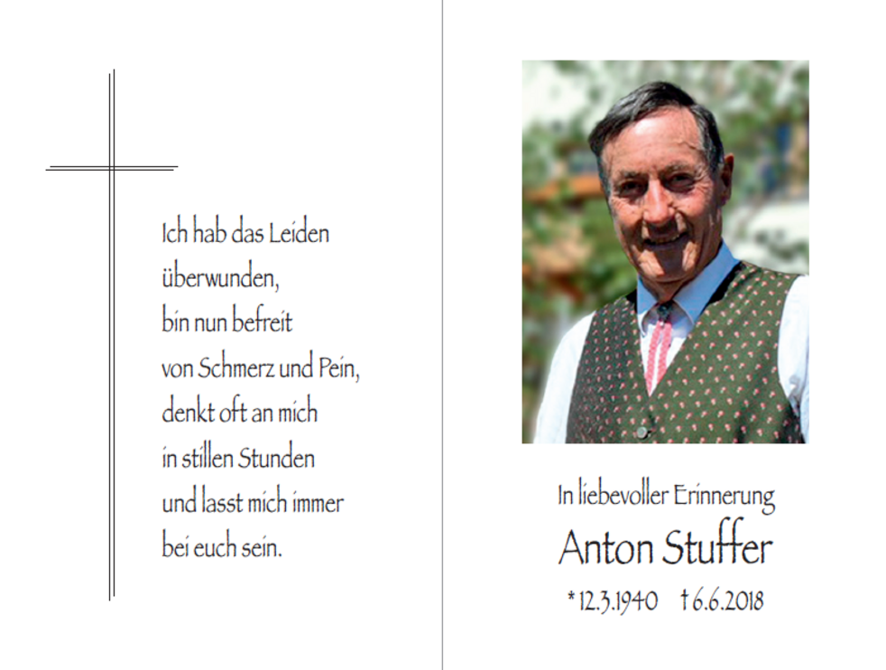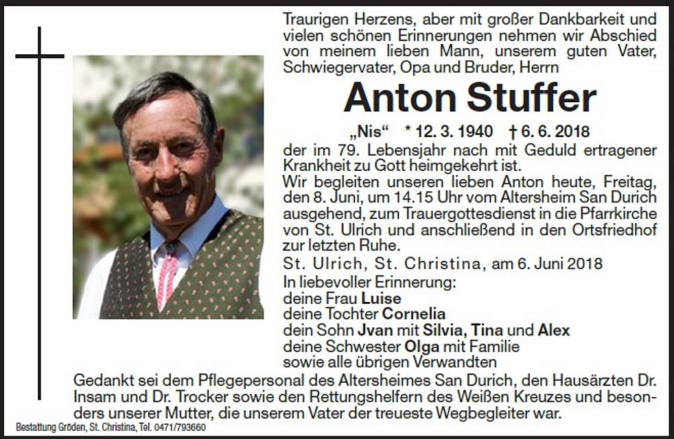Wir begleiten unseren lieben Anton am Freitag, dem 8. Juni, um 14.15 Uhr vom Altersheim San Durich ausgehend zum Trauergottesdienst in die Pfarrkirche von St. Ulrich und anschließend in den Ortsfriedhof zur letzten Ruhe.