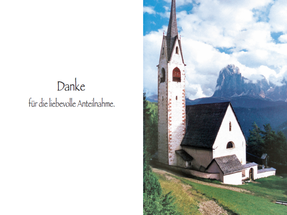 Gedankt sei dem Pflegepersonal des Altersheimes San Durich, den Hausärzten Dr. Insam und Dr. Trocker, sowie den Rettungshelfern des Weißen Kreuzes und besonders unserer Mutter, die unserem Vater der treueste Wegbegleiter war.