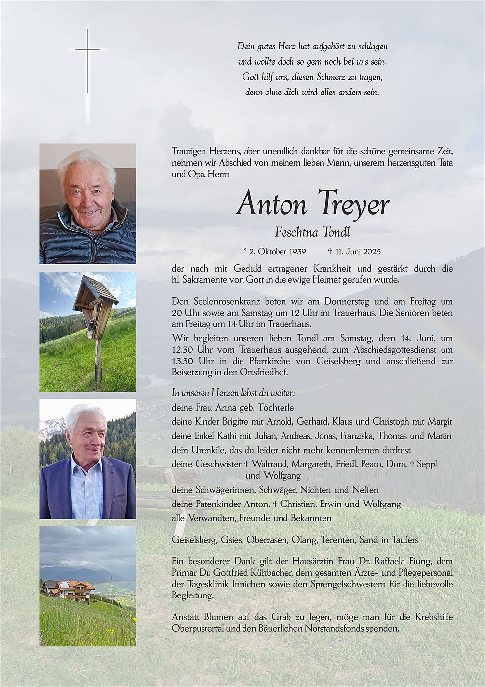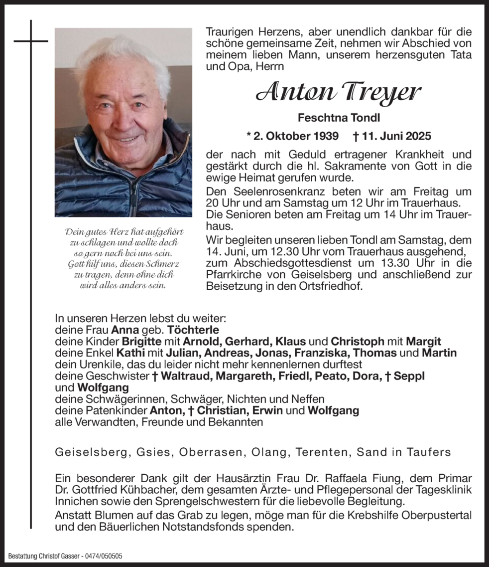 Anstatt Blumen auf das Grab zu legen, möge man für die Krebshilfe Oberpustertal und den Bäuerlichen Notstandsfonds spenden.