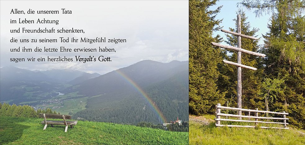Ein besonderer Dank gilt der Hausärztin Frau Dr. Raffaela Fiung, dem Primar Dr. Gottfried Kühbacher, dem gesamten Ärzte- und Pflegepersonal der Tagesklinik Innichen sowie den Sprengelschwestern für die liebevolle Begleitung.