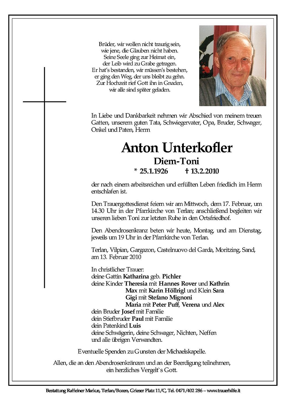 Den Trauergottesdienst feiern wir am Mittwoch, dem 17. Februar, um 14.30 Uhr in der Pfarrkirche von Terlan; anschließend begleiten wir unseren lieben Toni zur letzten Ruhe in den Ortsfriedhof.
