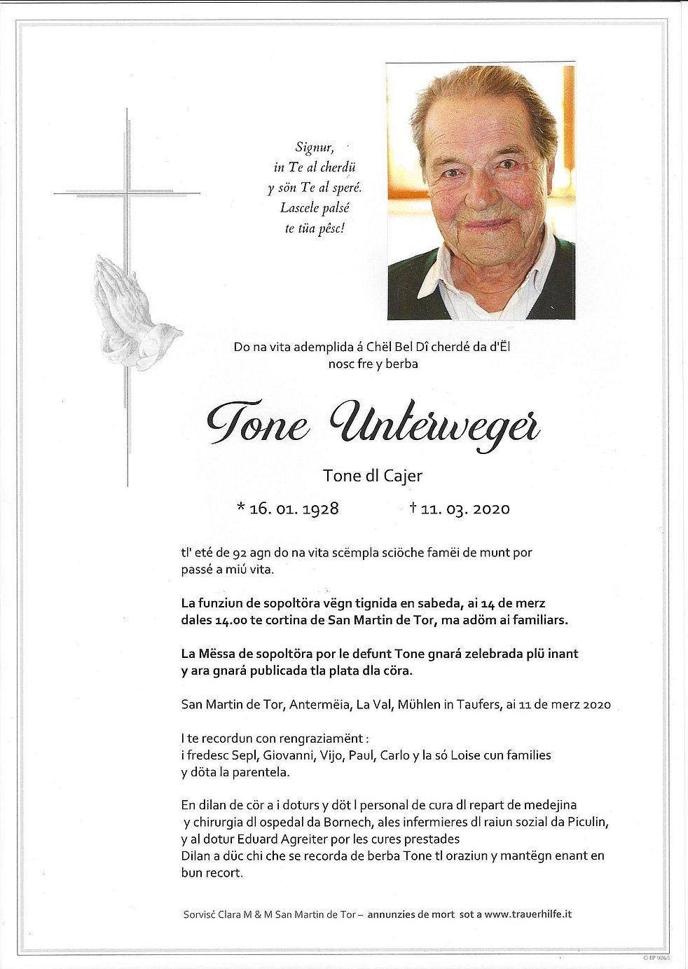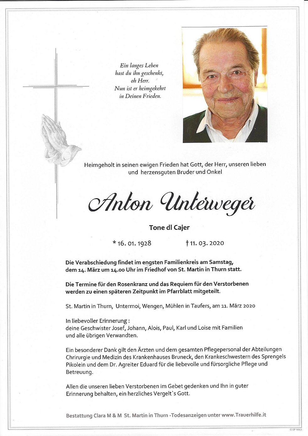 Die Verabschiedung findet im engsten Familienkreis am Samstag, dem 14. März um 14.00 Uhr im Friedhof von St. Martin in Thurn statt.