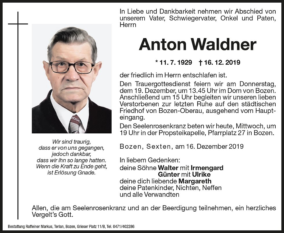 Den Trauergottesdienst feiern wir am Donnerstag, dem 19. Dezember, um 13.45 Uhr im Dom von Bozen. Anschlieβend um 15 Uhr begleiten wir unseren lieben Verstorbenen zur letzten Ruhe auf den städtischen Friedhof von Bozen-Oberau, ausgehend vom Haupteingang.