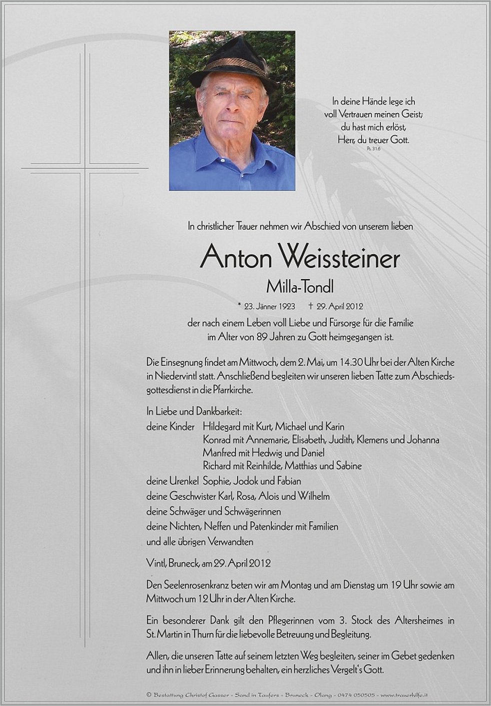 Die Einsegnung findet am Mittwoch, dem 2. Mai, um 14.30 Uhr bei der Alten Kirche in Niedervintl statt. Anschließend begleiten wir unseren lieben Tatte zum Abschiedsgottesdienst in die Pfarrkirche.