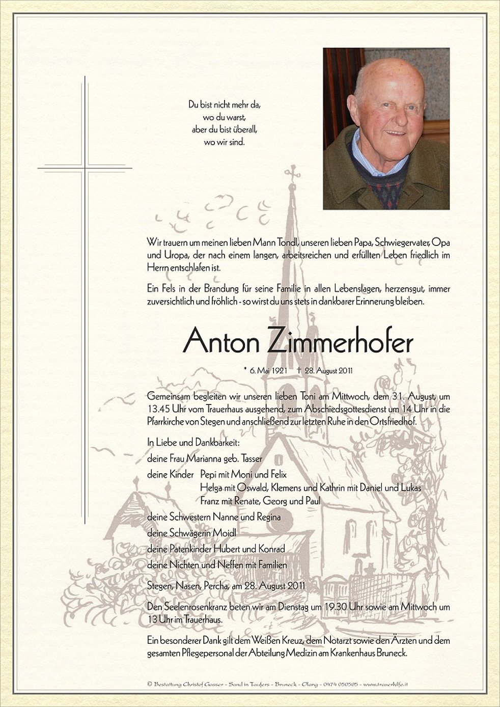 Gemeinsam begleiten wir unseren lieben Toni am Mittwoch, dem 31. August, um 13.45 Uhr vom Trauerhaus ausgehend, zum Abschiedsgottesdienst um 14 Uhr in die Pfarrkirche von Stegen und anschließend zur letzten Ruhe in den Ortsfriedhof.