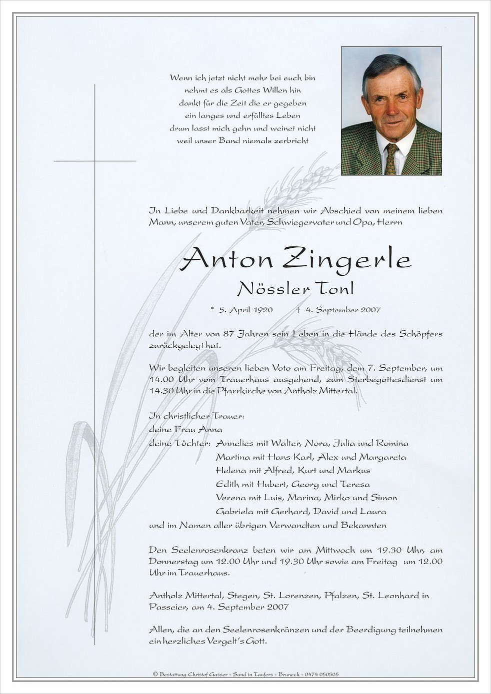 Wir begleiten unseren lieben Voto am Freitag, dem 7. September, um 14.00 Uhr vom Trauerhaus ausgehend, zum Sterbegottesdienst um 14.30 Uhr in die Pfarrkirche von Antholz Mittertal.