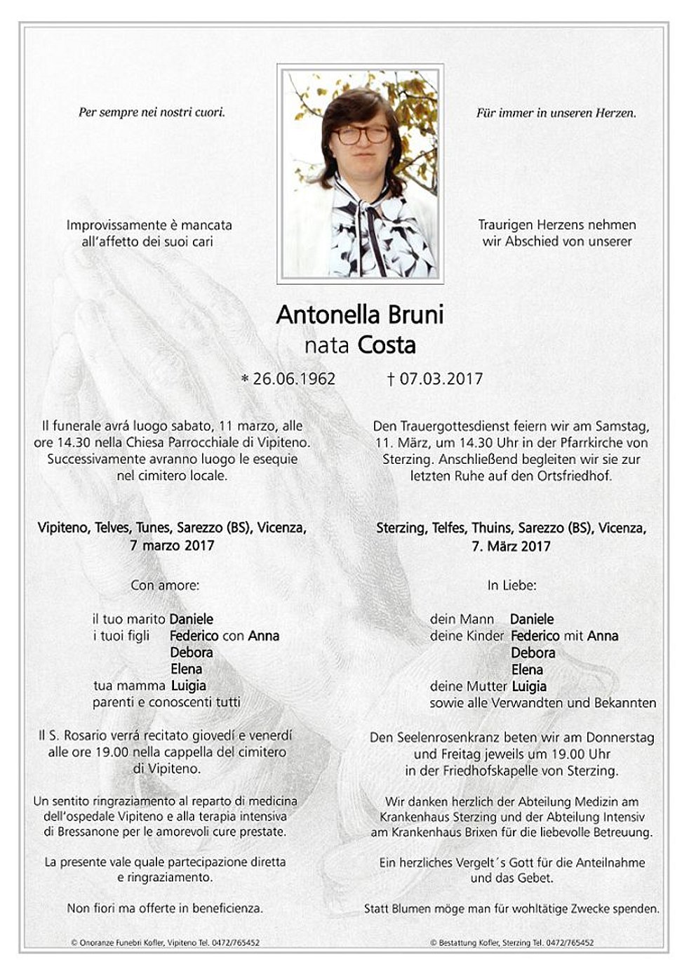 Den Trauergottesdienst feiern wir am Samstag, 11. März, um 14.30 Uhr in der Pfarrkirche von Sterzing. Anschließend begleiten wir sie zur letzten Ruhe auf den Ortsfriedhof.