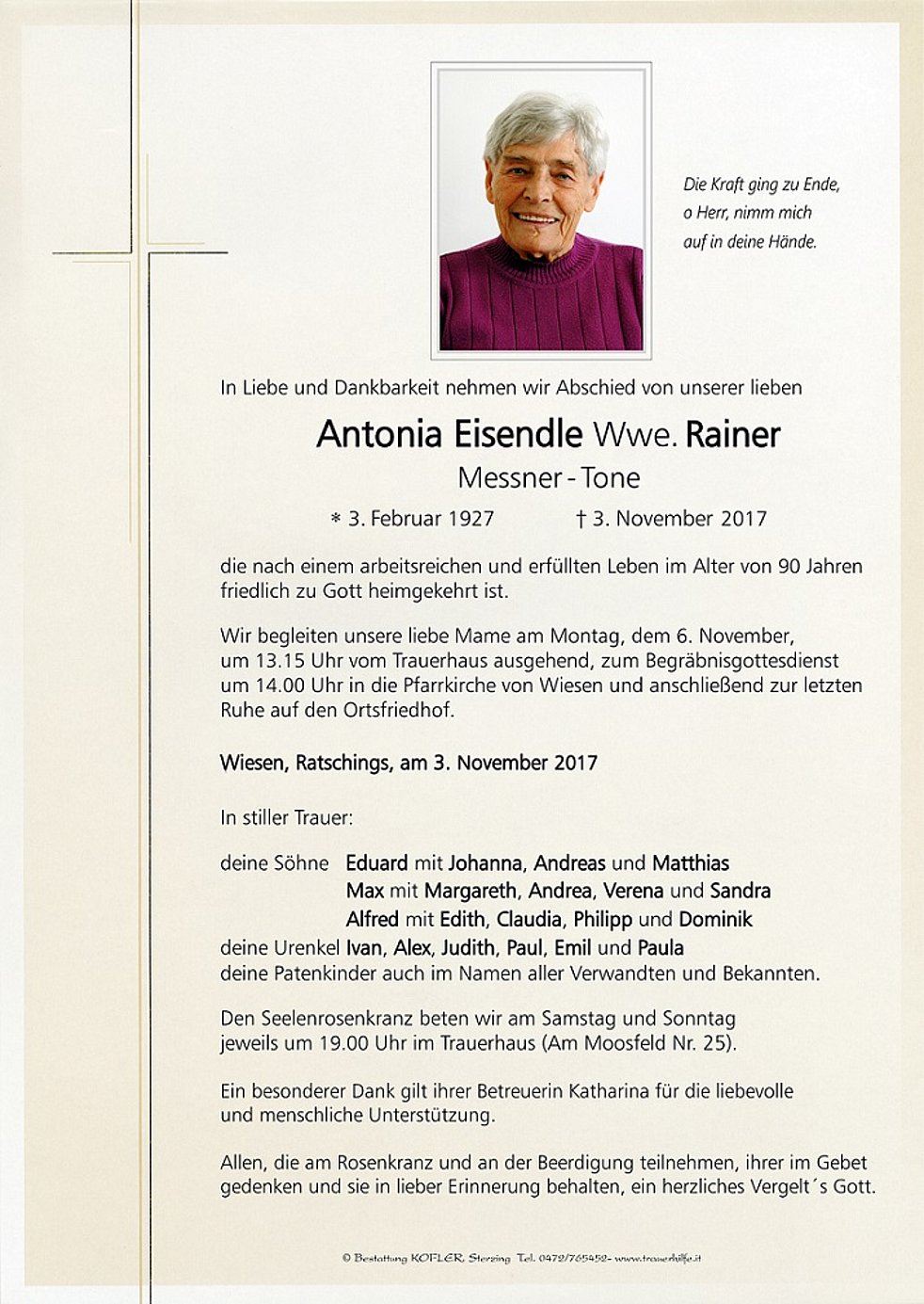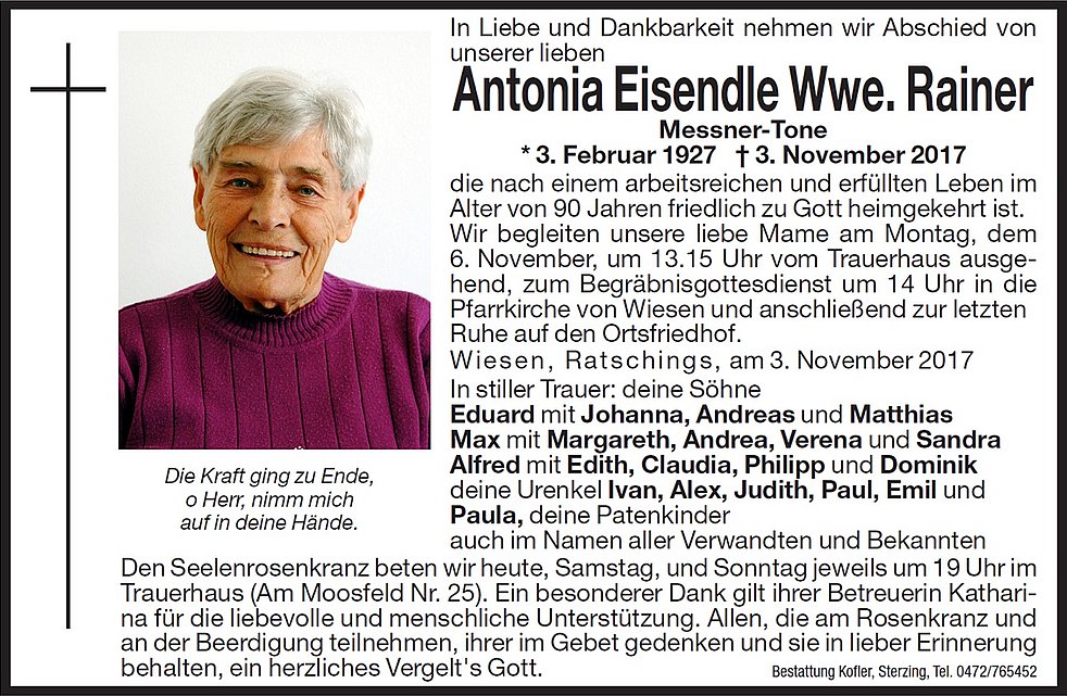 Wir begleiten unsere liebe Mame am Montag, dem 6. November, um 13.15 Uhr vom Trauerhaus ausgehend, zum Begräbnisgottesdienst um 14.00 Uhr in die Pfarrkirche von Wiesen und anschließend zur letzten Ruhe auf den Ortsfriedhof.