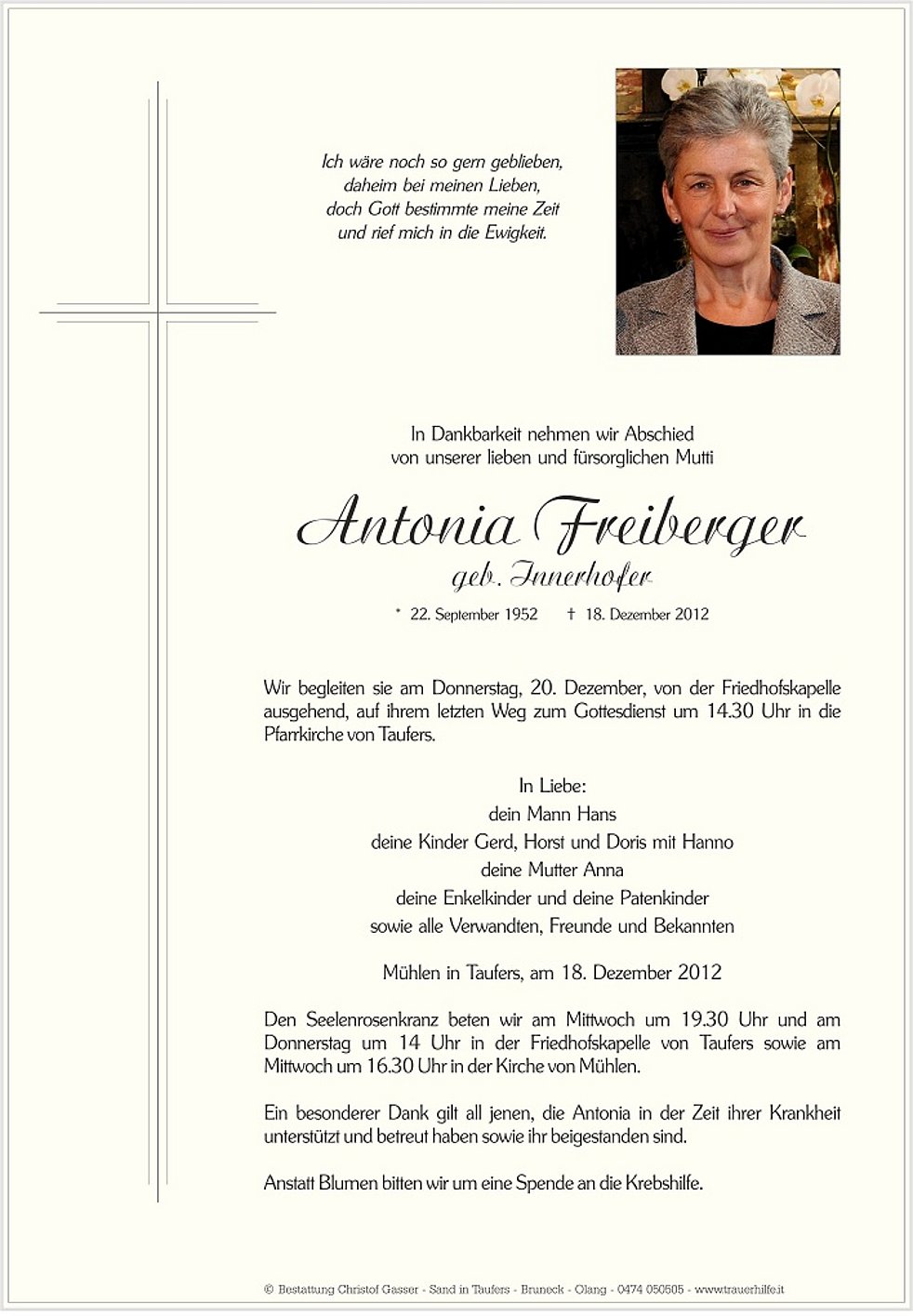 Ein besonderer Dank gilt all jenen, die Antonia in der Zeit ihrer Krankheit unterstützt und betreut haben sowie ihr beigestanden sind.