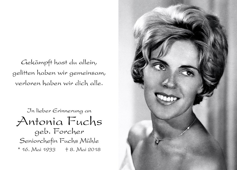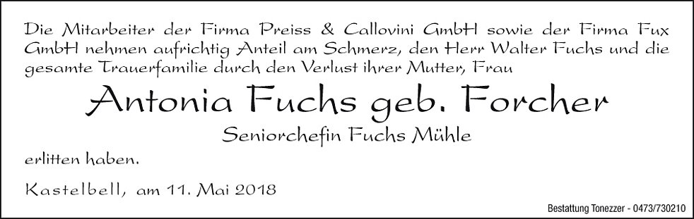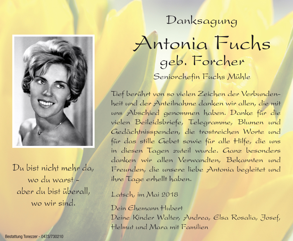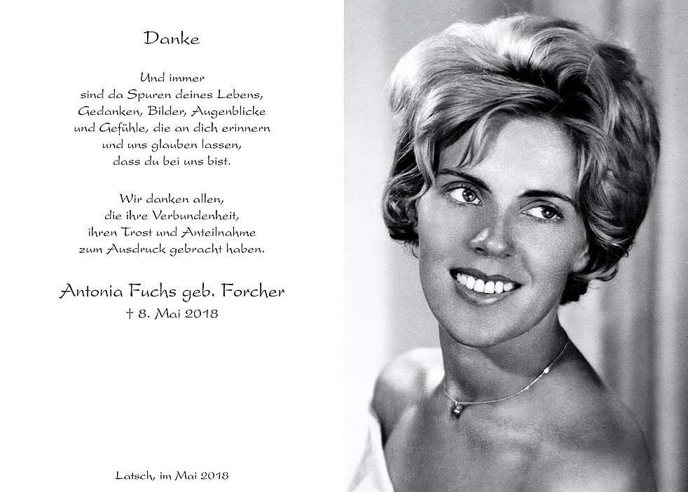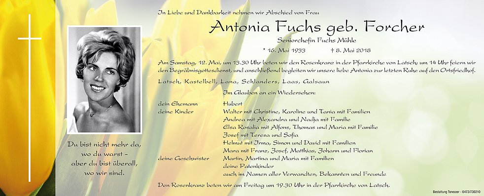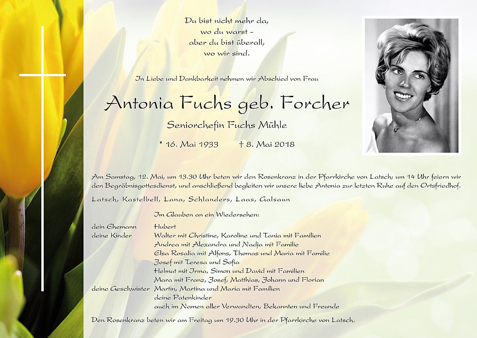 Am Samstag, 12. Mai, um 13.30 Uhr beten wir den Rosenkranz in der Pfarrkirche von Latsch; um 14 Uhr feiern wir den Begräbnisgottesdienst, und anschließend begleiten wir unsere liebe Antonia zur letzten Ruhe auf den Ortsfriedhof.