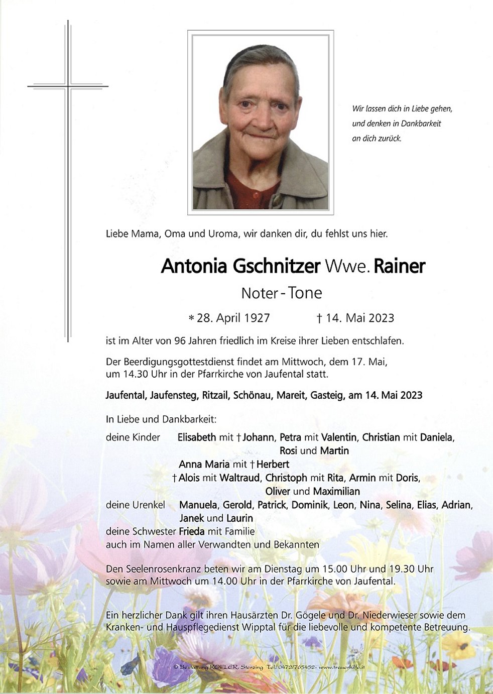 Ein herzlicher Dank gilt ihren Hausärzten Dr. Gögele und Dr. Niederwieser sowie dem Kranken- und Hauspflegedienst Wipptal für die liebevolle und kompetente Betreuung.