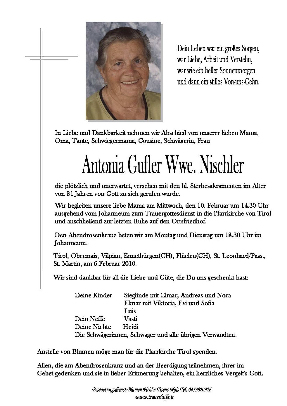 Anstelle von Blumen möge man für die Pfarrkirche Tirol spenden.