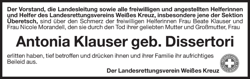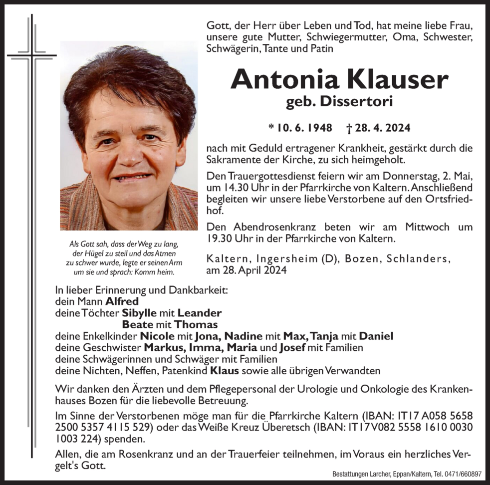 Im Sinne der Verstorbenen möge man für die Pfarrkirche Kaltern (IBAN IT17 A058 5658 2500 5357 4115 529) oder das Weiße Kreuz Überetsch (IBAN: IT17 V082 5558 1610 0030 1003 224) spenden.
