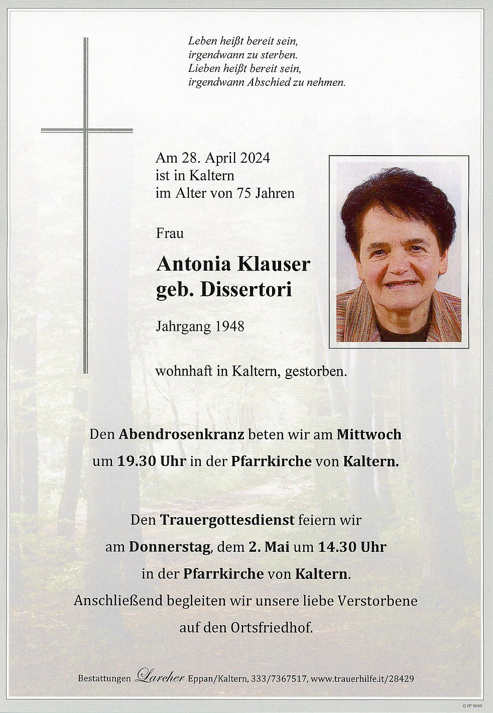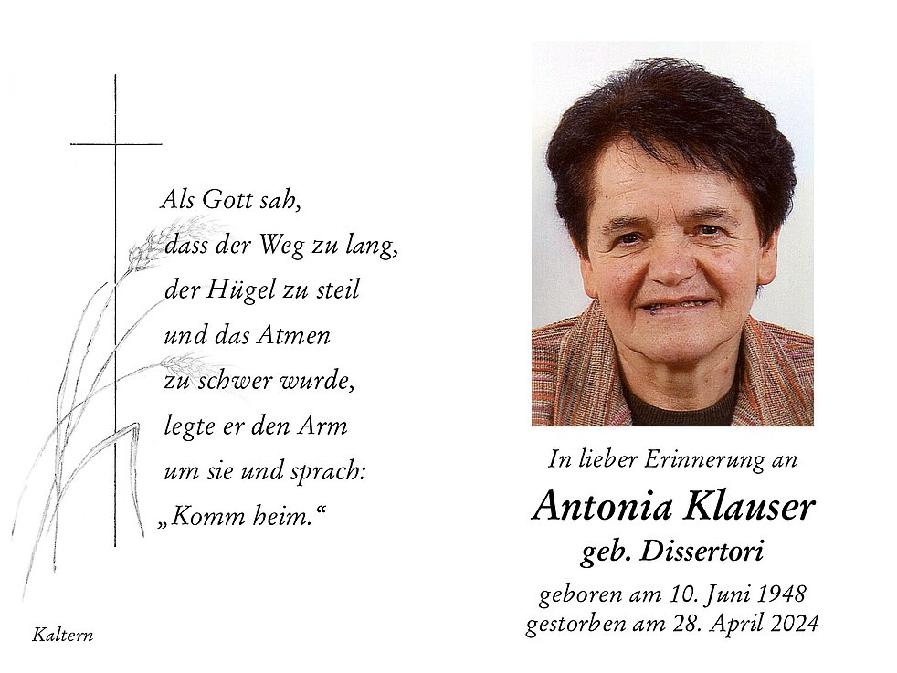 Den Trauergottesdienst feiern wir am Donnerstag, 2. Mai um 14.30 Uhr in der Pfarrkirche von Kaltern. Anschließend begleiten wir unsere liebe Verstorbene auf den Ortsfriedhof.